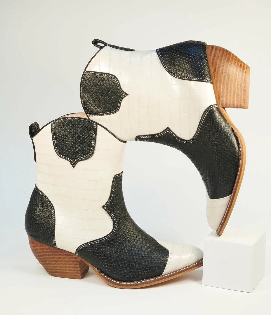Show off your home roots, gals! These classic barn raising kicks are crafted in a fabulous white crocodile embossed leatherette with black snakeskin embossed accents. The pointed toes and 2.5 inch block heels keep you feeling feminine!