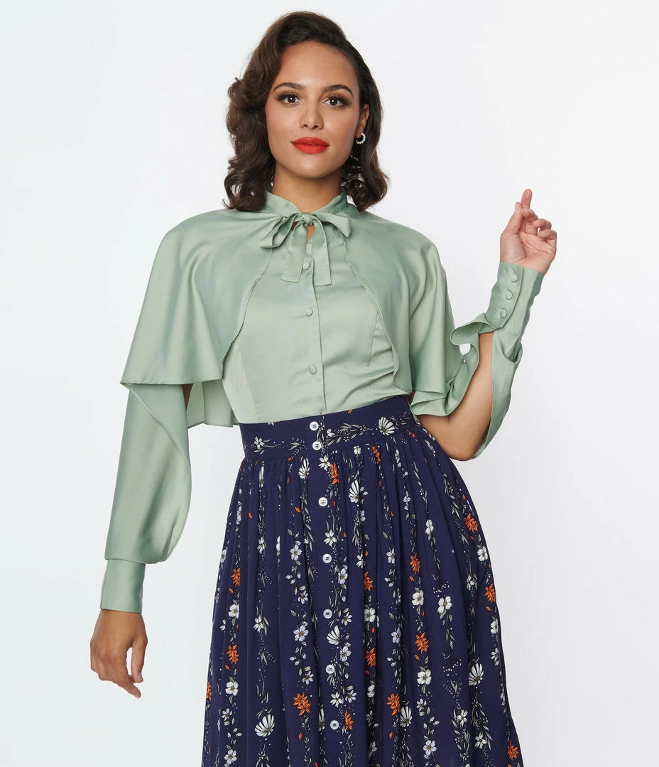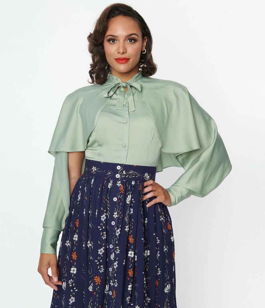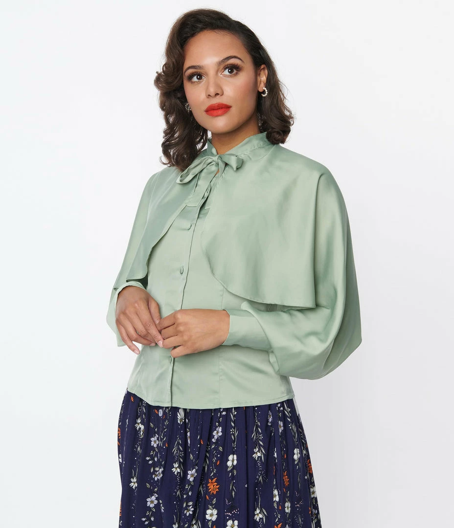 This charming blouse from Voodoo Vixen is crafted in a gorgeous sage green satin and boasts a sweet capelet back that drops into open long sleeves cinched with button cuffs. Complete with a button up front that leads to a darling self tie bow collar!