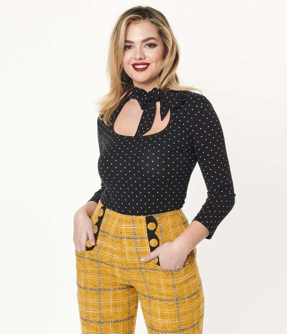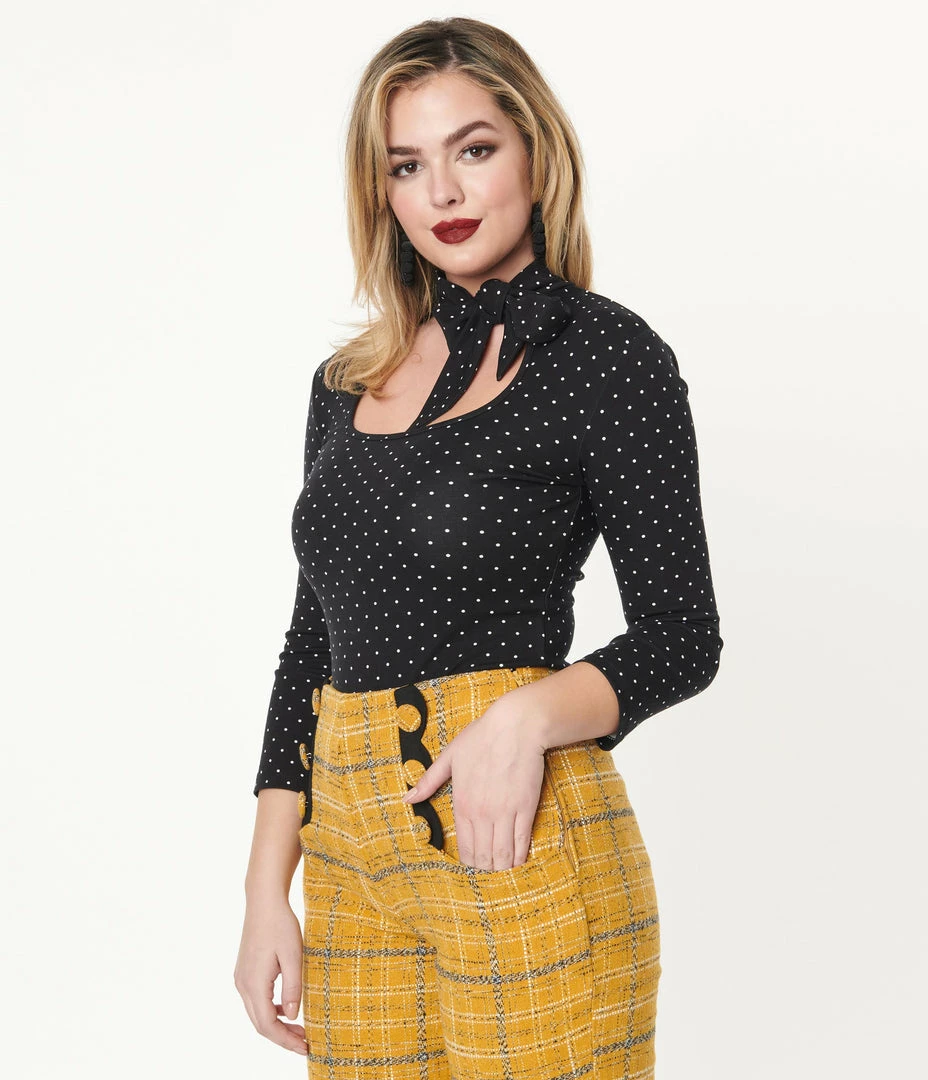 Time to be spotted, dolls! This glorious separate from Voodoo Vixen is crafted in a soft knit blend and has white polka dots dancing throughout the black backdrop. The bodice boasts a fun self tie neck bow that creates a sultry keyhole accent, and is framed by the three-quarter length sleeves, while the fitted bodice bodice drops to a straight hem perfect for tucking into your favorite pants or skirt!