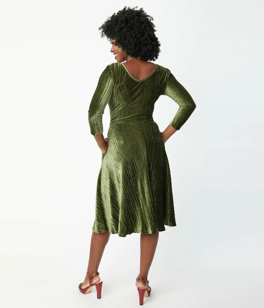 A velvet maverick, dolls! Strike your pose in this sultry swing dress from Voodoo Vixen, crafted in a fabulous olive green velvet that dances with an embossed pattern throughout. The sultry V-neckline is framed by three-quarter length sleeves and centered by a faux knit accent. The banded waist is cinched with a side zipper while the sweeping swing skirt drops to your knees and is outfitted with side pockets!