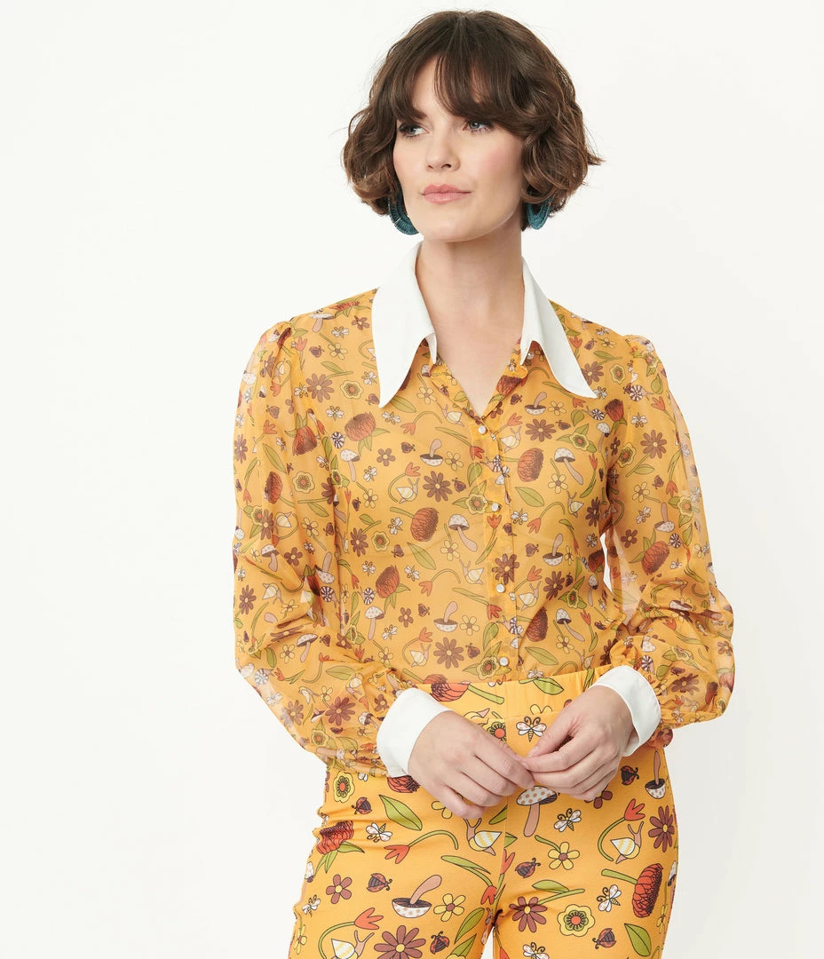 This darling blouse is crafted in fabulous sheer chiffon boasting a retro garden party print complete with florals, snails, mushrooms, and butterflies throughout that mustard yellow backdrop. This button up staple, complete with a sweet white collar and billowing long sleeves, cinched with button cuffs!