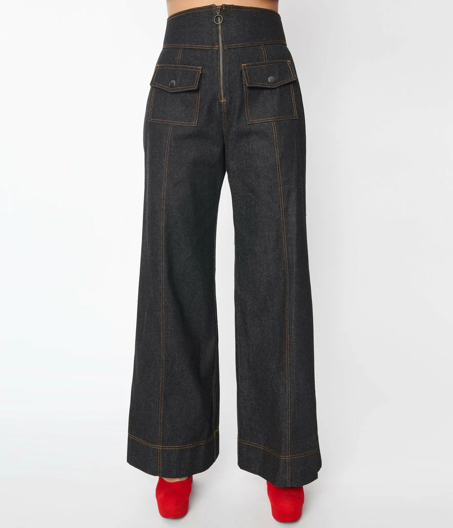 These high waisted jeans are crafted in a black denim fabric and are outfitted with a front zipper, wide legs, back pockets, and two front classic buttons flap pockets.