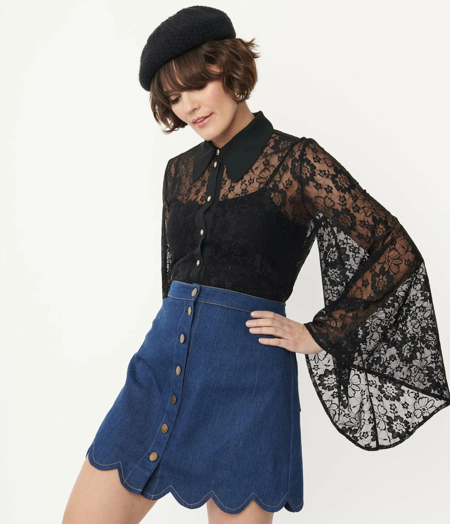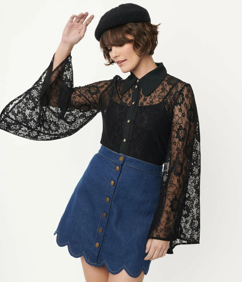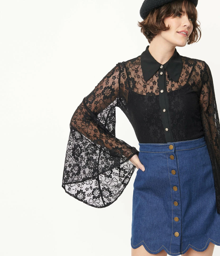 Divine devotion, dears! A heart-stopping silhouette from Smak Parlour, the sheer blouse boasts a beautiful floral lace set in black throughout. The button up front leads to a classic collar while the romantic bell sleeves are an exquisite addition to your ensemble!