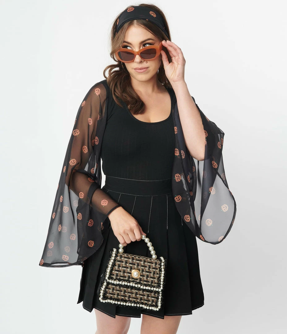 This frightening striking bodysuit is crafted in a soft black knit and features sheer long bell sleeves, dancing with orange jack-o-lantern pumpkins throughout. Complete with a scoop neckline and a dual snap button closure.