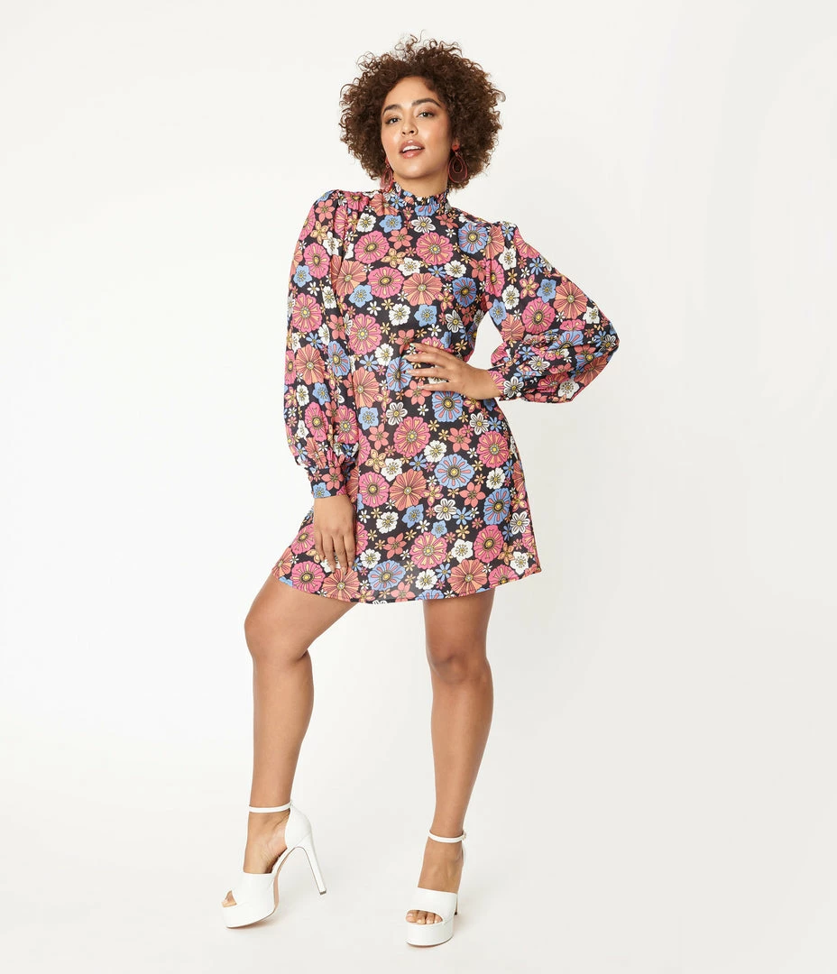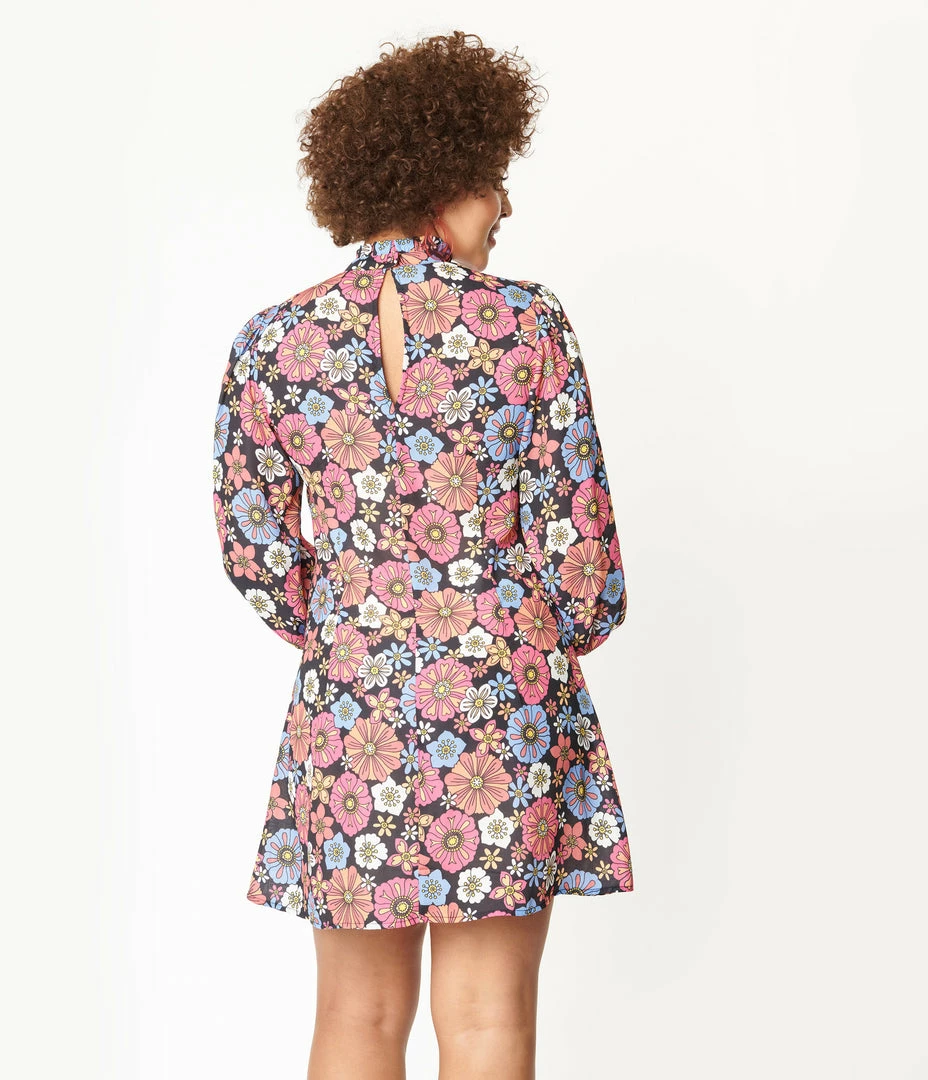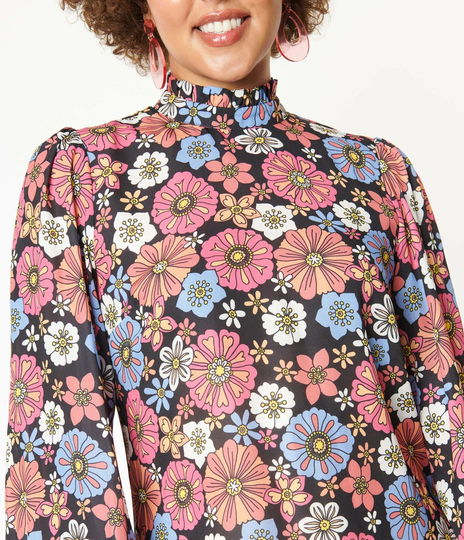 Crafted in a lightweight crepe with a delightful floral print in shades of purple, pink, orange, and white throughout a black backdrop. The darted bodice and slightly tapered waist lends a dash of form while the high ruffled neckline is secured in the back with a button keyhole. The billowing long sleeves are cinched with a button cuff while the shortened hemline provides eye-catching form!