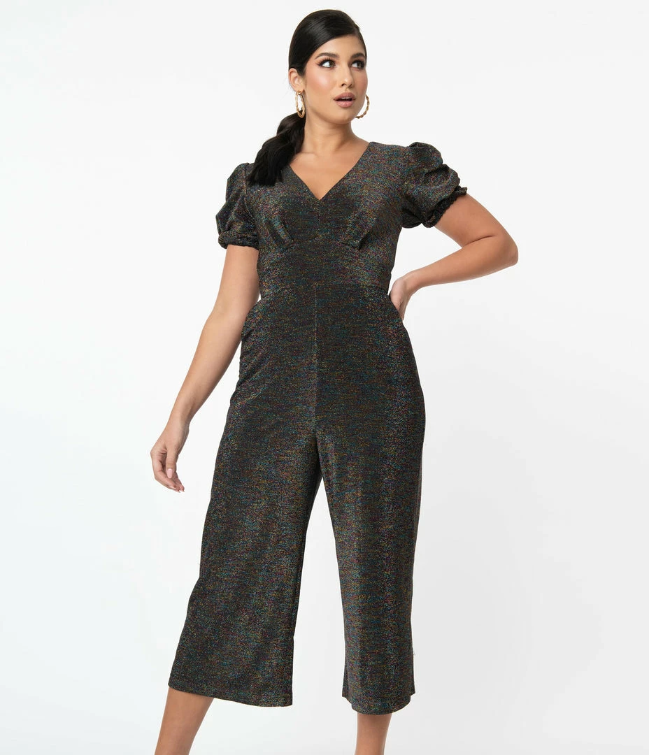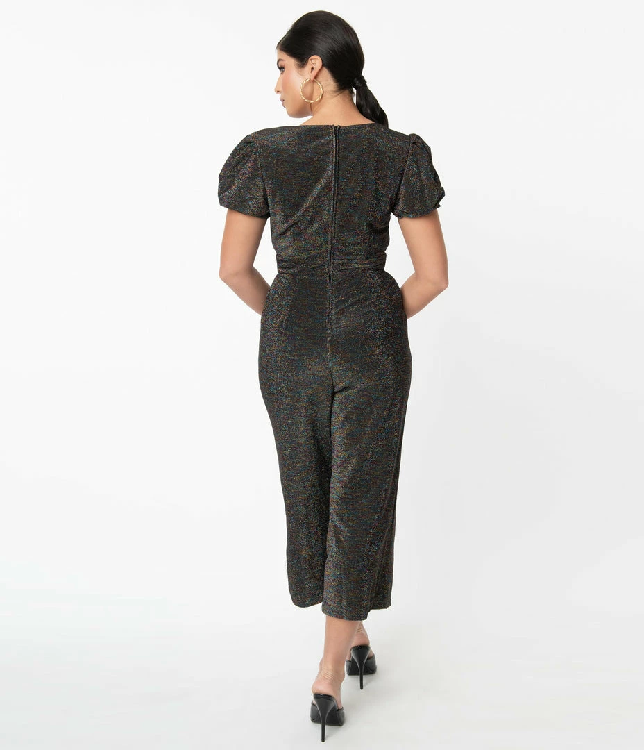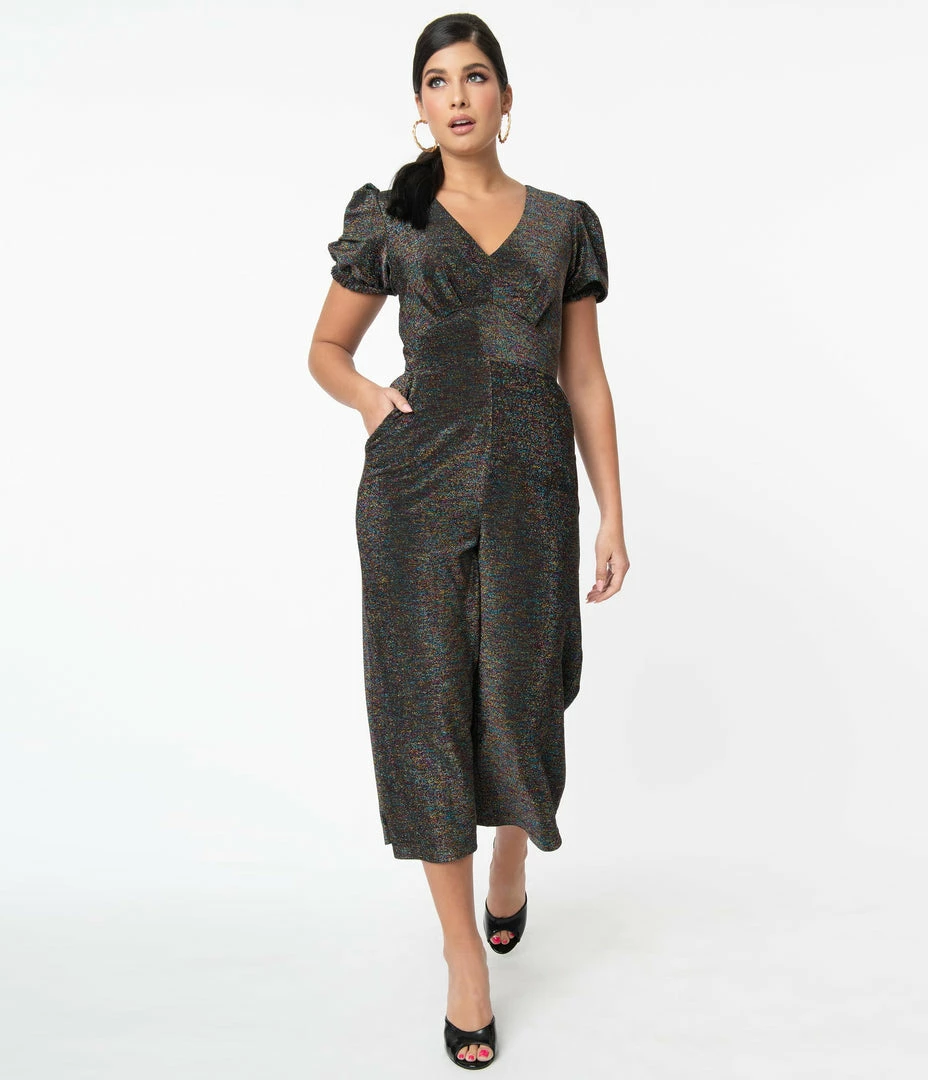 For the well-connected dame! This fabulous jumpsuit from Smak Parlour is crafted in a dazzling black knit that sparkles with rainbow metallic threading. The Hostess-With-The-Mostess Jumpsuit features a sultry V-neckline and a marvelous pointed and banded waist that is cinched with a back zipper while the sweet short sleeves drop into an elastic cuff for a flirtatious flounce. The cropped wide leg pants are outfitted with side pockets for modern convenience while hosting your next soiree!