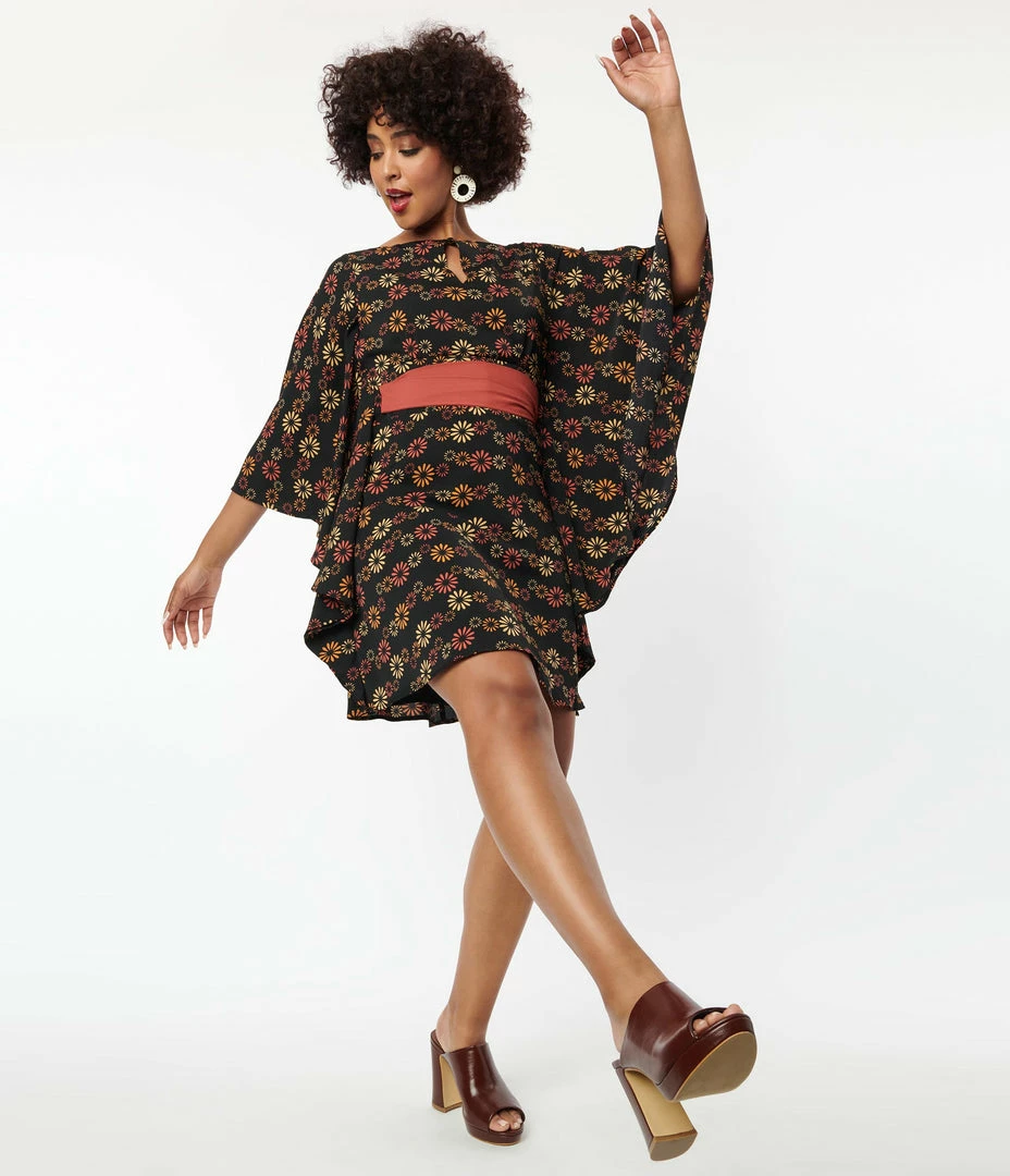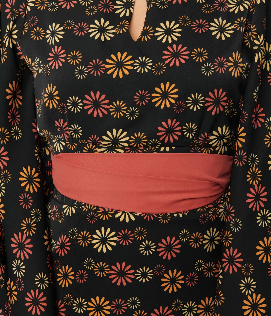 This sweet caftan dress boasts red, orange, and beige florals throughout the black woven fabric. The sultry top is centered by a button keyhole, framed by open and sweeping three-quarter length sleeves, while the banded waist is cinched attached ties that thread through for a fabulous fit to your figure.
