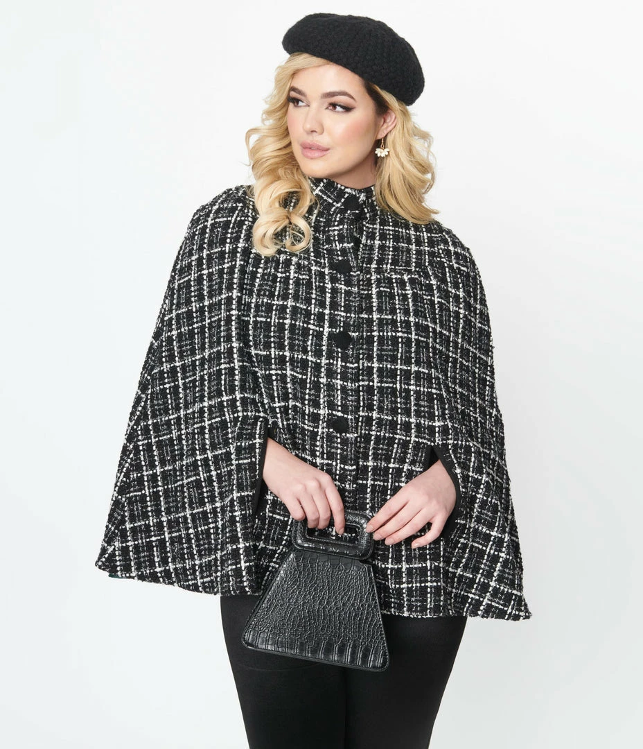Fabulously mod-inspired, this cape coat is crafted in a fabulous tweed fabric and set in black and white plaid. Outfitted with a button up front, high collar, and arm slits for a chic silhouette.