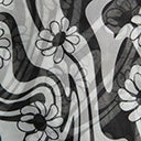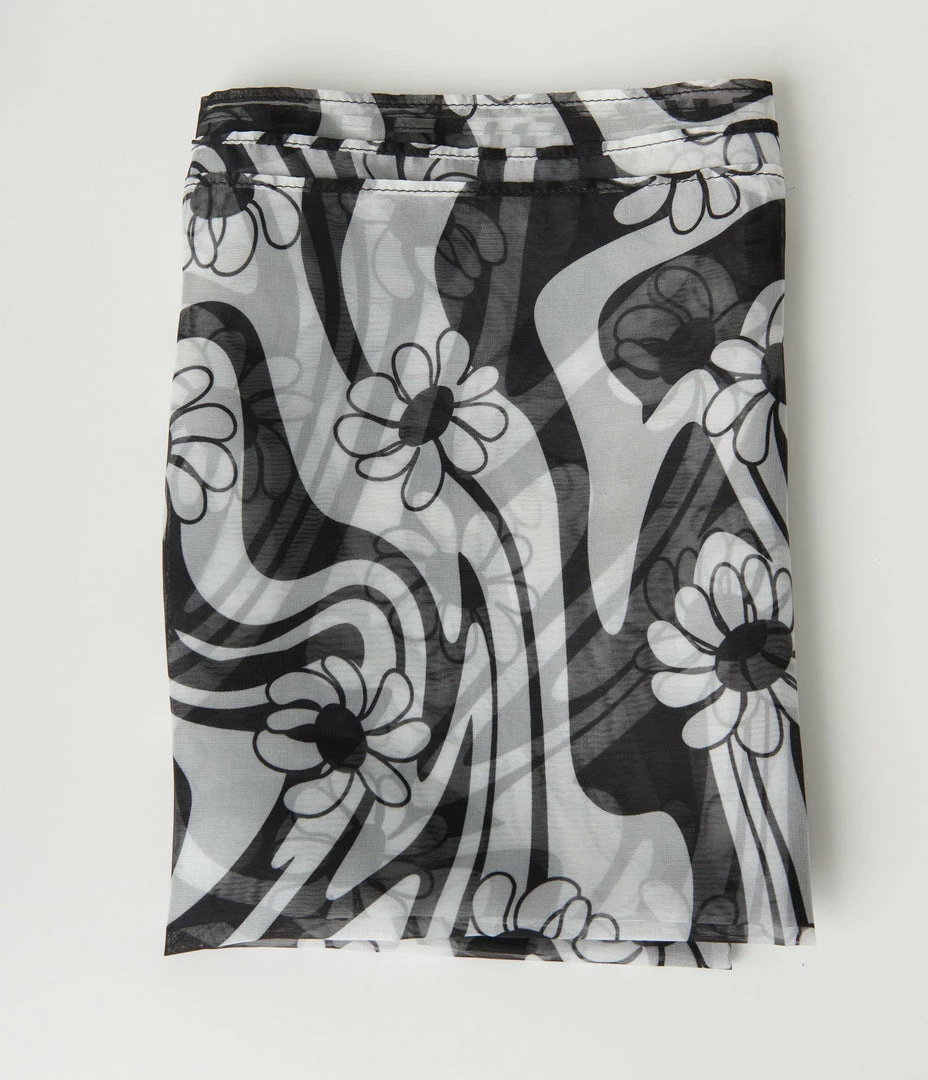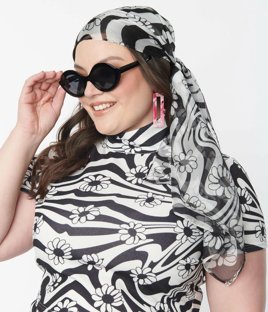 This groovy long hair scarf is crafted in a silky chiffon style fabric that boasts a wavy black and white pattern that dances with daisies throughout.