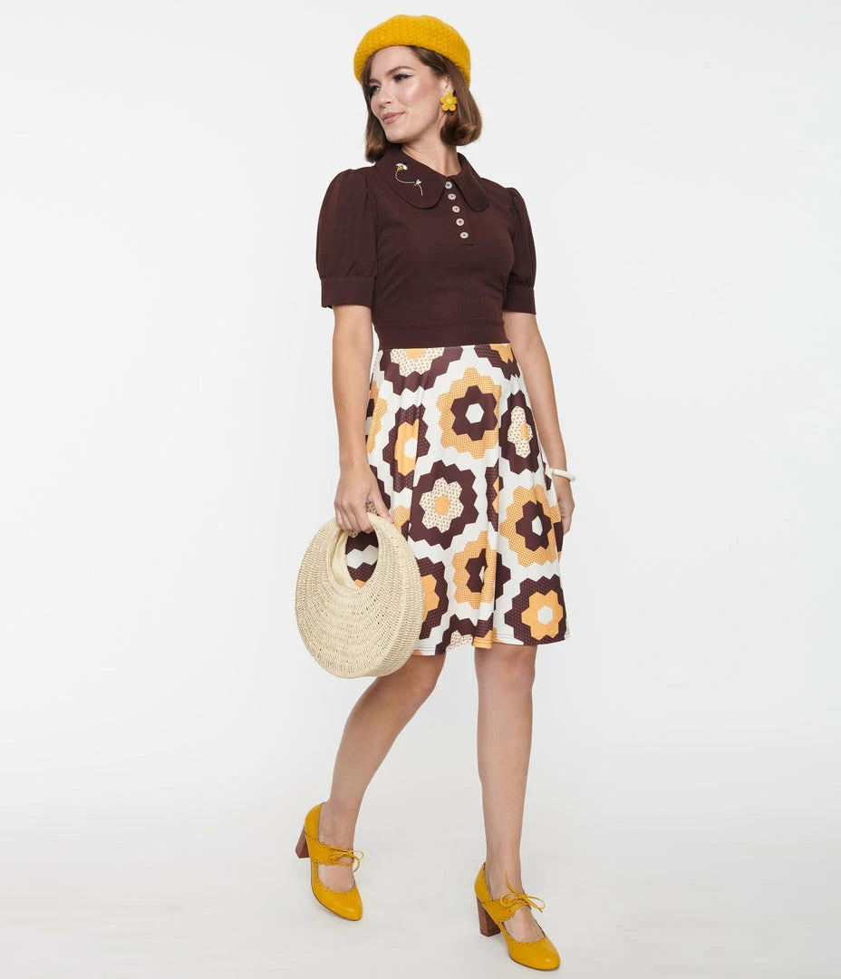 This sweet flare dress is crafted in a knit blend that features a solid brown top and a playful flare skirt that dances with a brown and honey yellow honeycomb pattern in a unique quilted design. Outfitted with a side zipper, a partial button up front, and a charming embroidered honeybee accent on the collar.