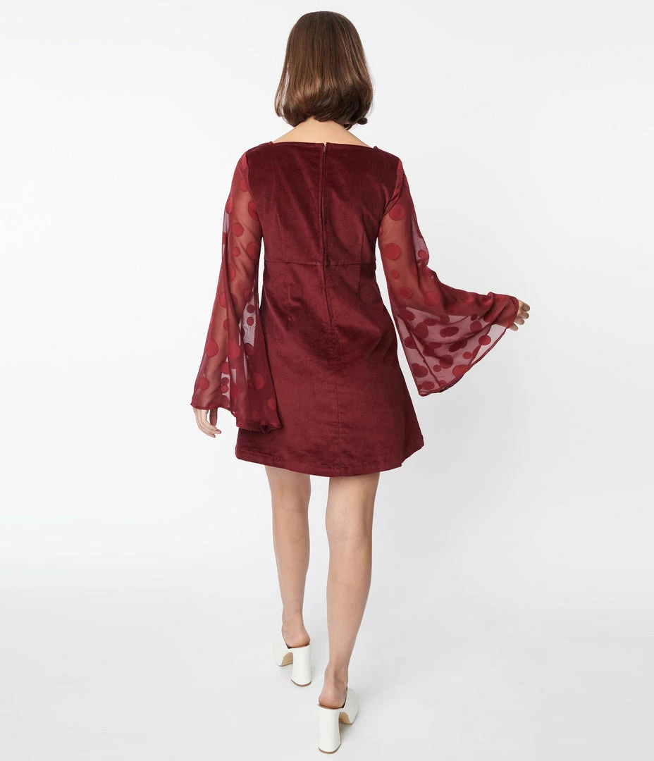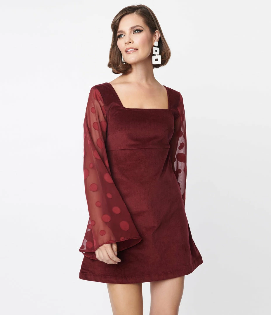 This sweet dress is crafted in a marvelous burgundy corduroy. Boasting a square neckline that is framed by dazzling chiffon bell sleeves accented with floral appliques, while the A-line skirt has side pockets!