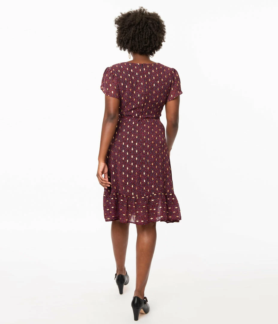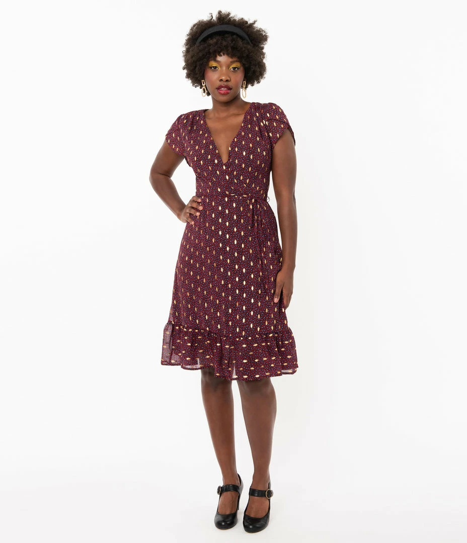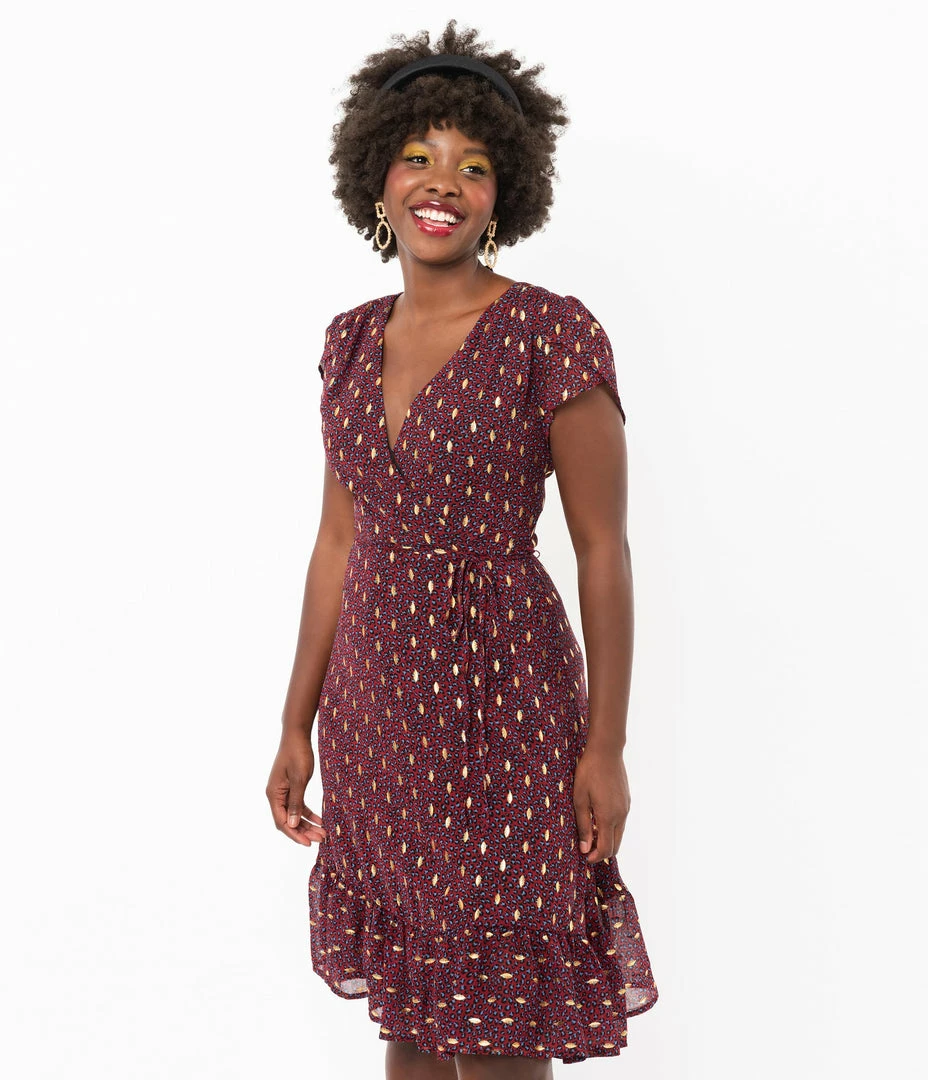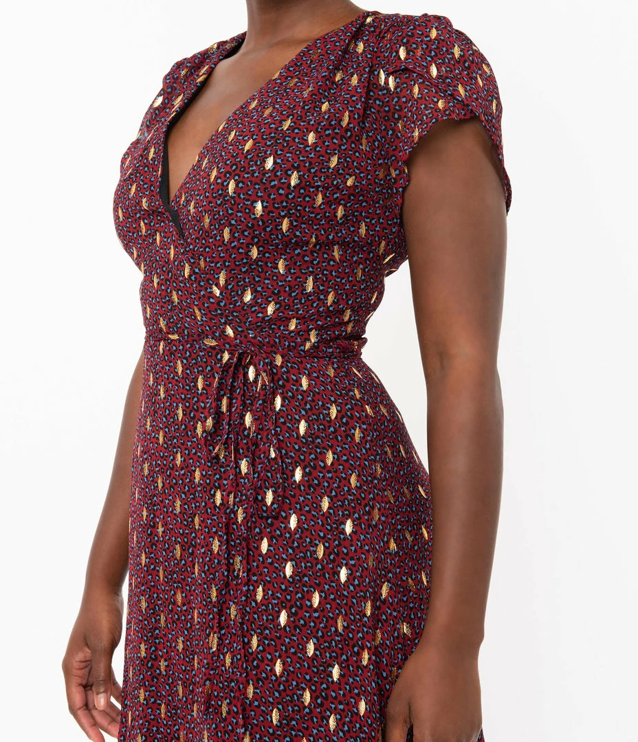 The game has begun, darling! This beautiful sparkling dress from Smak Parlour boasts a delightful burgundy red leopard print that sparkles with golden accents throughout for added elegance, fully lined for fabulous comfort. The sultry surplice neckline features tulip sleeves for vintage charm while the seamed waist can be cinched with a matching corded tie. The graceful midi skirt cascades to a ruffle hem that sways around your knees. Outfitted with a back zipper, itโs a solid game plan!