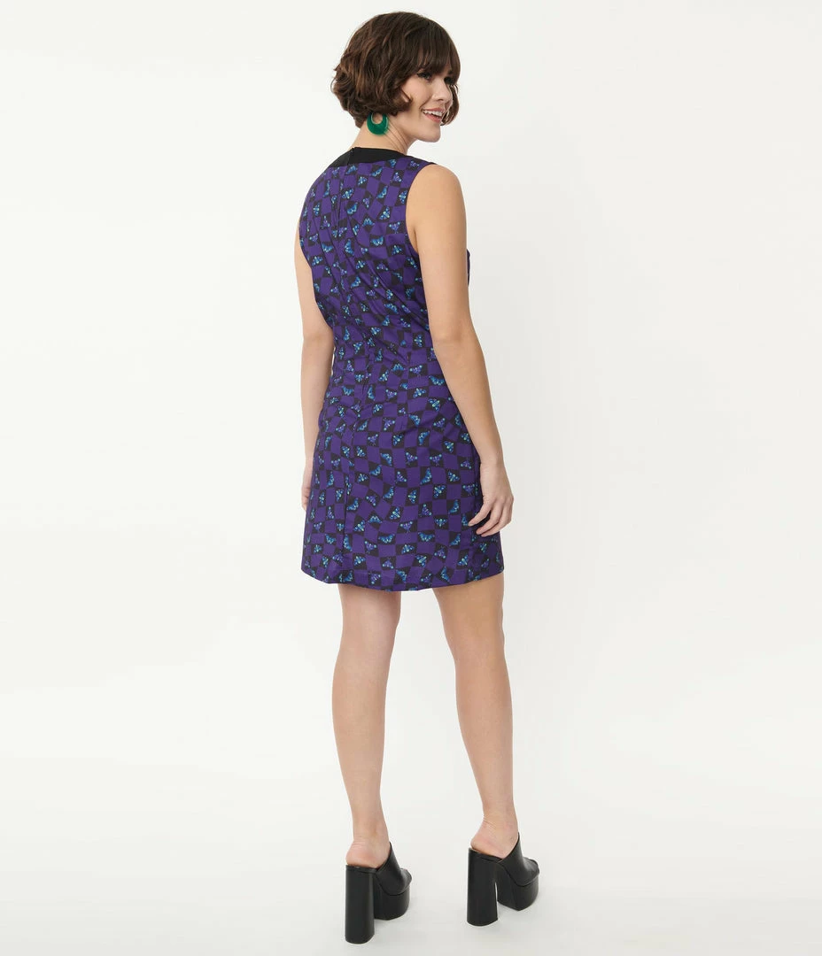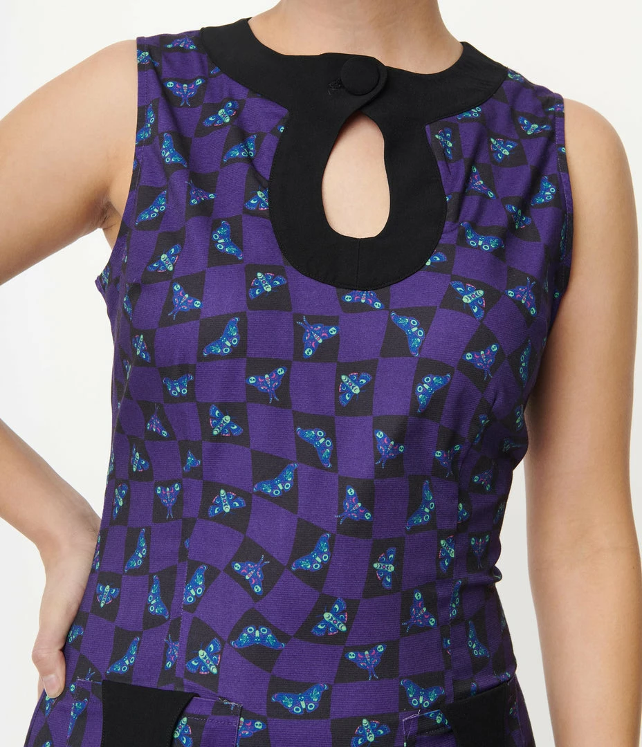 This retro inspired mini dress features a chilling print of green and purple moths dancing throughout the purple and black checkerboard backdrop. Crafted in a woven blend and outfitted with faux buttons, a back zipper, and front pockets.