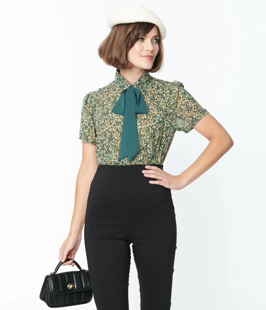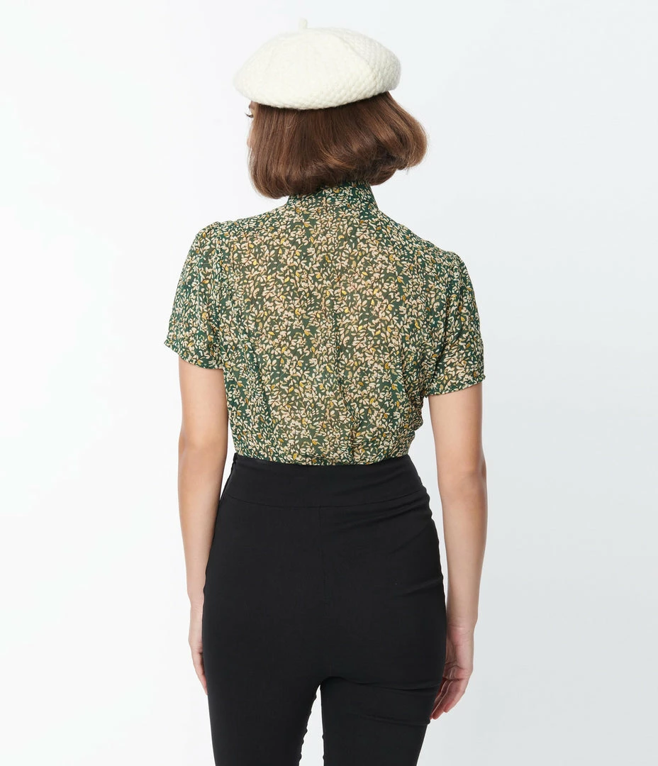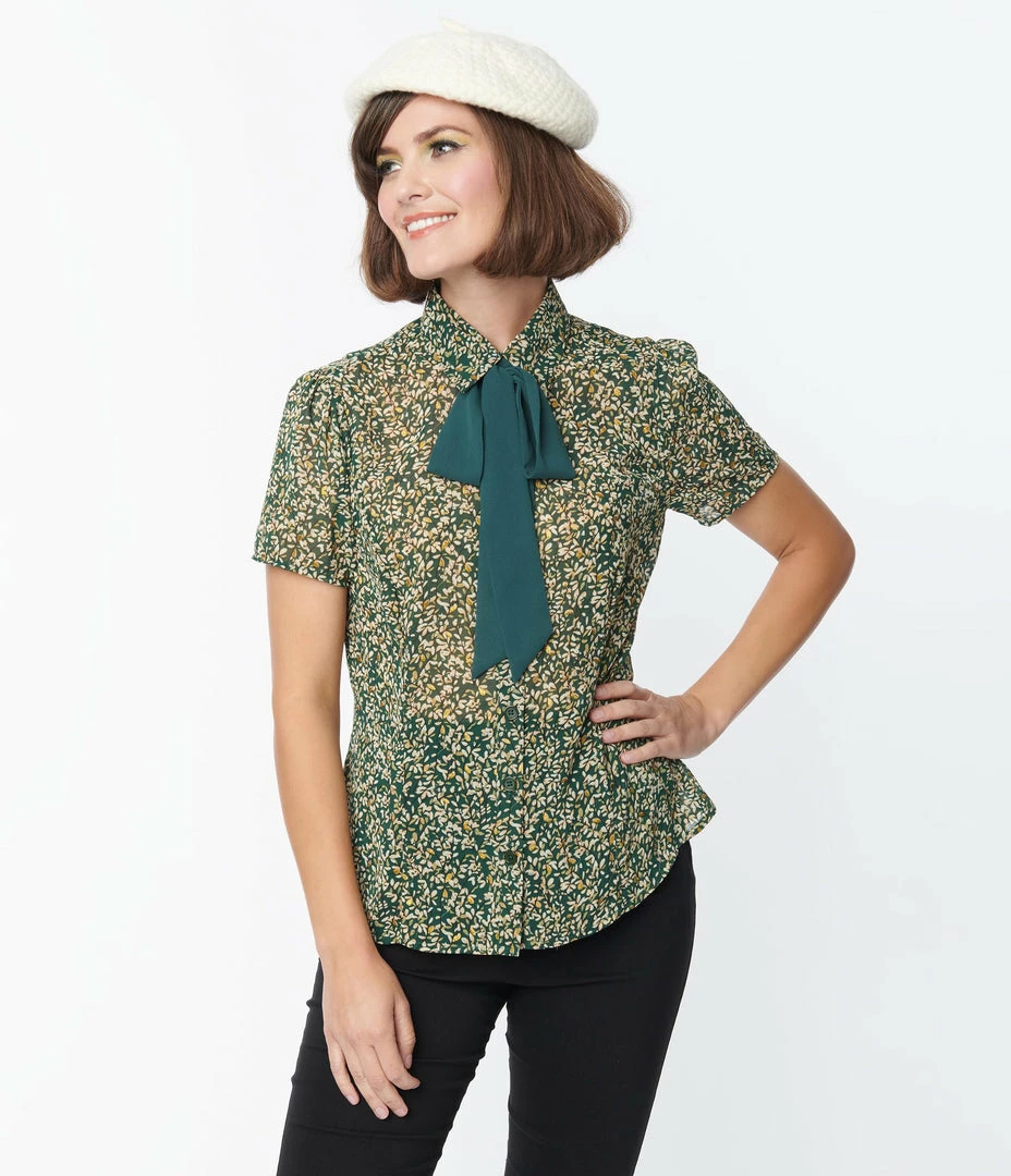 This chic blouse is crafted in a semi-sheer chiffon woven fabric featuring white and gold leaf print throughout the green background. Outfitted with a button up front and a green removable neck tie in for versatile styling.