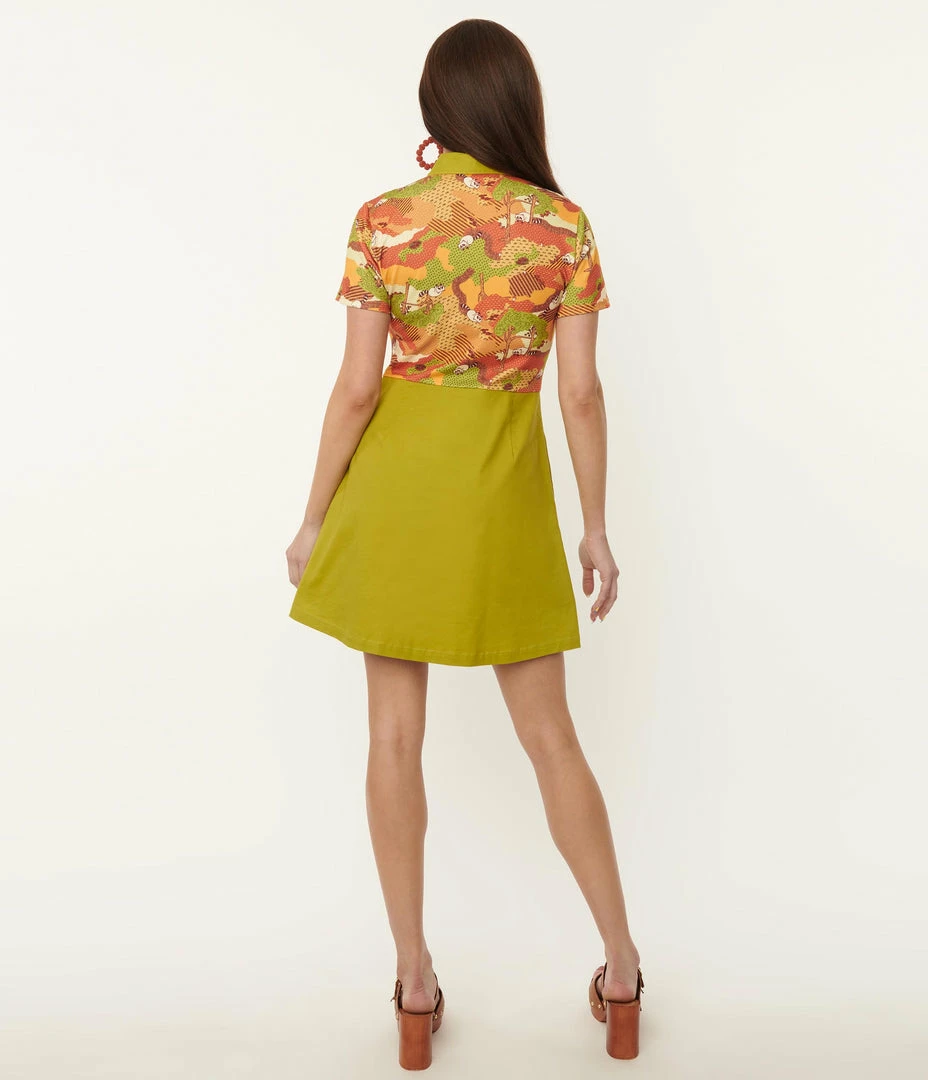 This charming mini dress is crafted in a knit fabric and features a sweet print of raccoons in a park during the fall, in shades of orange, green and brown. The partial button front leads to a solid green collar framed by short sleeves. The solid green woven skirt drops from the seamed waist features side pockets and is secured by the side zipper.