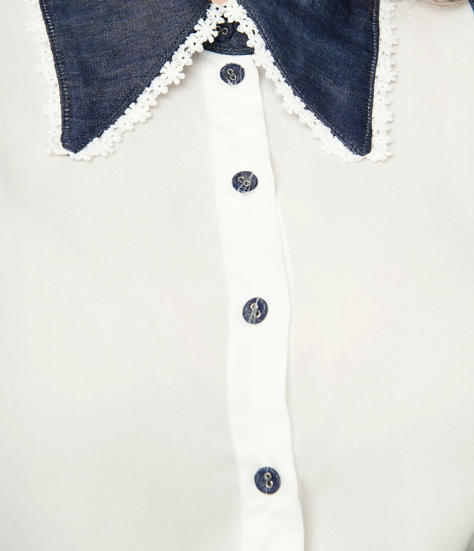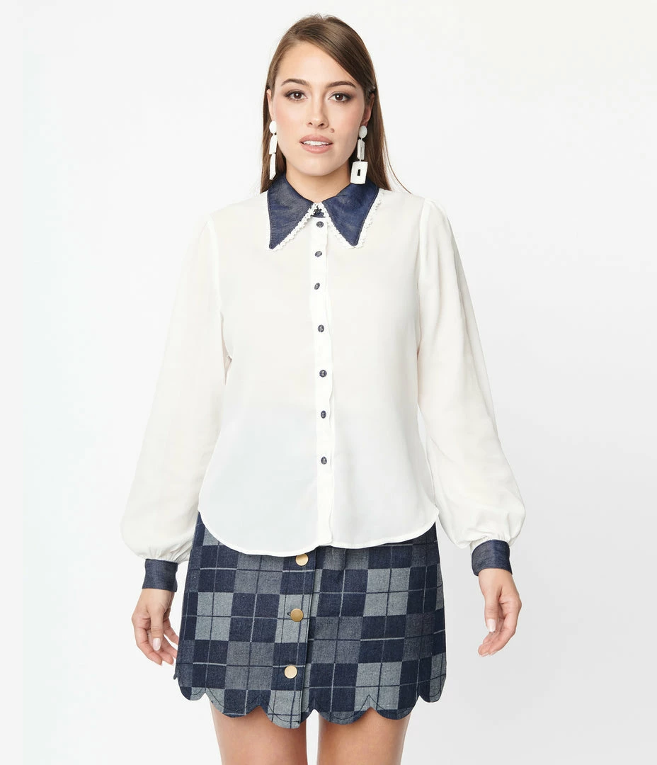 This gorgeous blouse is crafted in sheer ivory chiffon-style fabric. This vintage style frock is a button up staple, complete with a solid dark chambray collar and billowing long sleeves, cinched with button cuffs!
