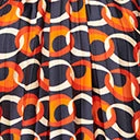 This adorable dress is crafted in a gorgeous satin-like woven fabric that dances with a chain link print in shades of red, beige, and cream throughout the navy blue backdrop. The high neckline is accented with a self tie bow, while the accordion pleated shift dress dances high above the knees!