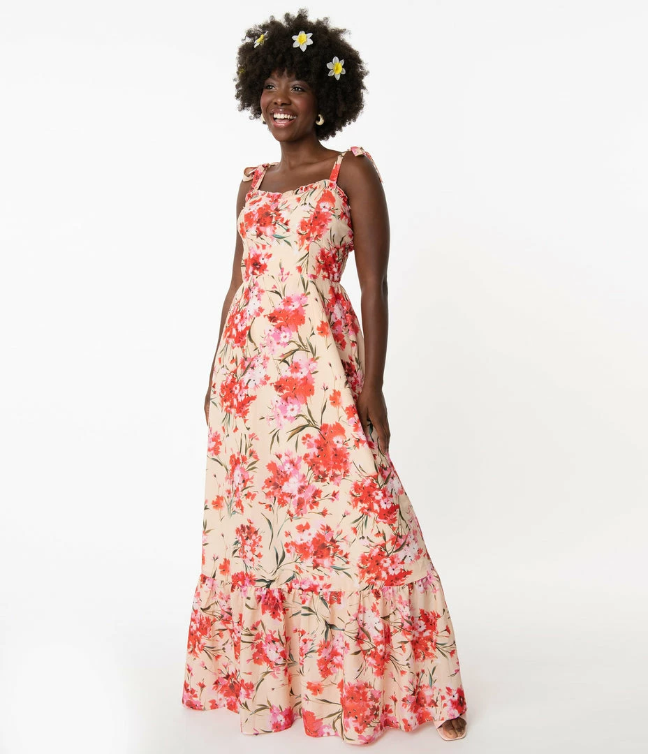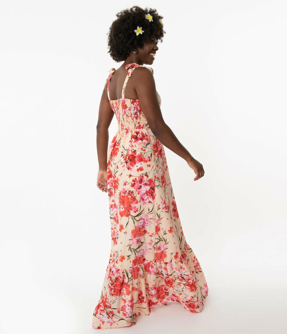The whole world is your garden, dears! A graceful silhouette for vintage frolics, the Flower Child Dress from Smak Parlour is a dream gown, crafted in a beautiful peach crepe that dazzles with pink brushed florals. The flirtatious sweetheart bodice is supported with adjustable, self tie straps while a smocked back provides a flattering fit. A sweeping maxi skirt cascades into a ruffled border hem that sweeps around your toes for angelic form!