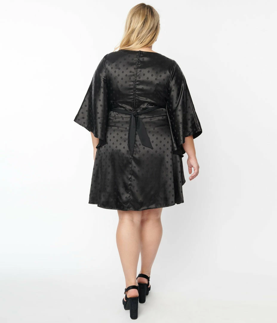 This dazzling plus size caftan dress boasts black damask polka dots throughout the black satin woven fabric. The sultry top is centered by a button keyhole while the open and sweeping three-quarter length sleeves, while the banded waist is cinched attached ties that thread through for a fabulous fit to your figure.