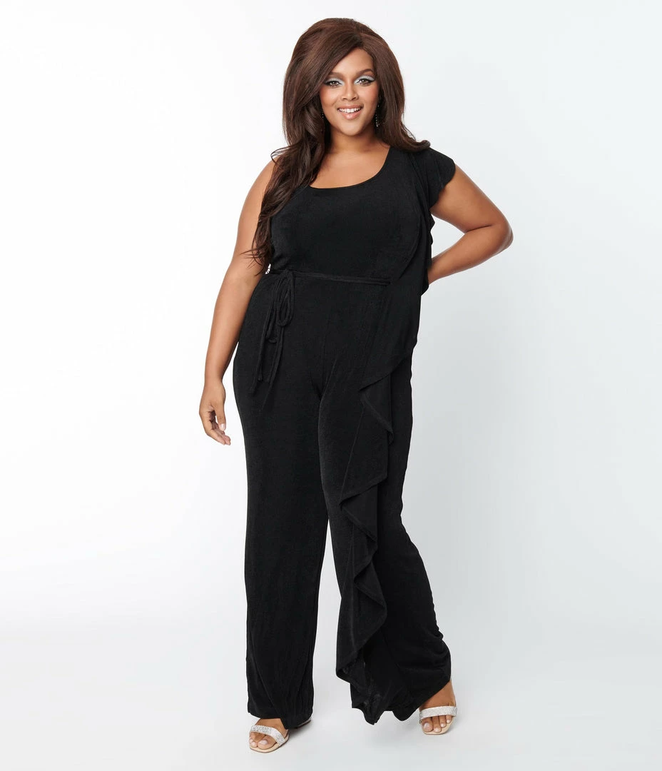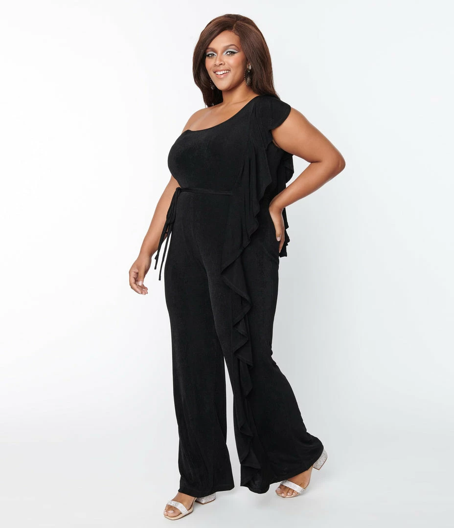 A romantic plus size silhouette crafted in a slinky black knit that features a one shoulder design with a dreamy ruffle cascading through the jumpsuit to the straight leg. Complete with a sash and lining.