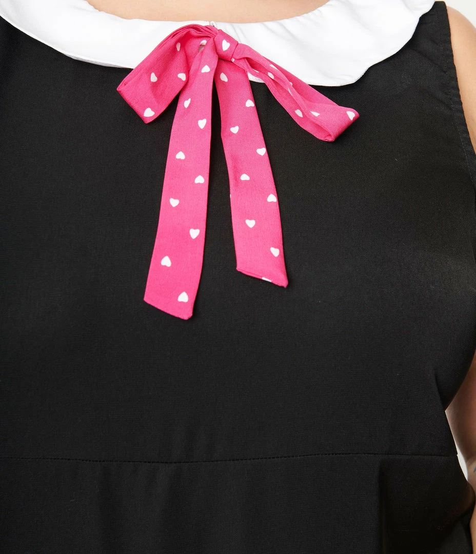 This adorable plus size shift dress is crafted in a black crepe fabric. The sleeveless design is accented with a contrasting white Peter Pan collar complete with a self tie neck bow in pink and white hearts. Complete with back zipper!