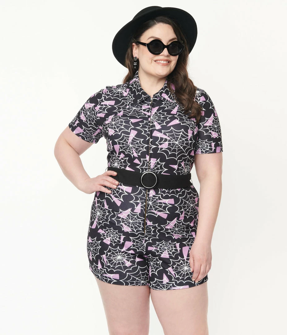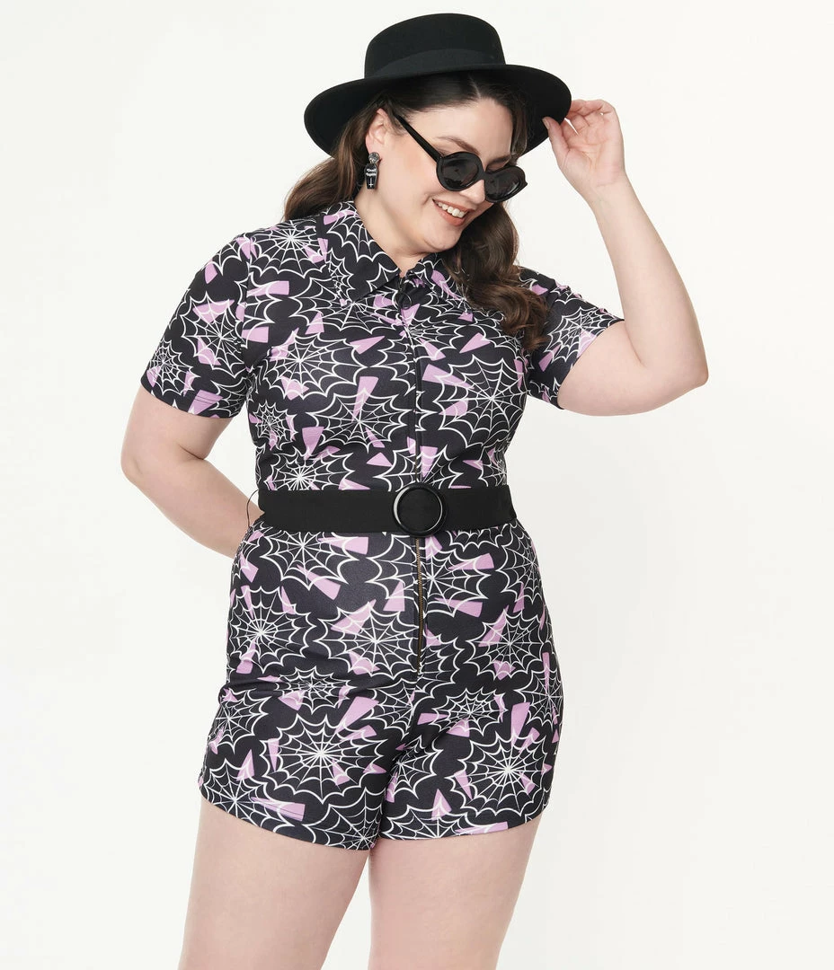 Coupon ๐งจ Smak Parlour Plus Size Black & Purple Spiderweb Print Belted Romper ๐งจ