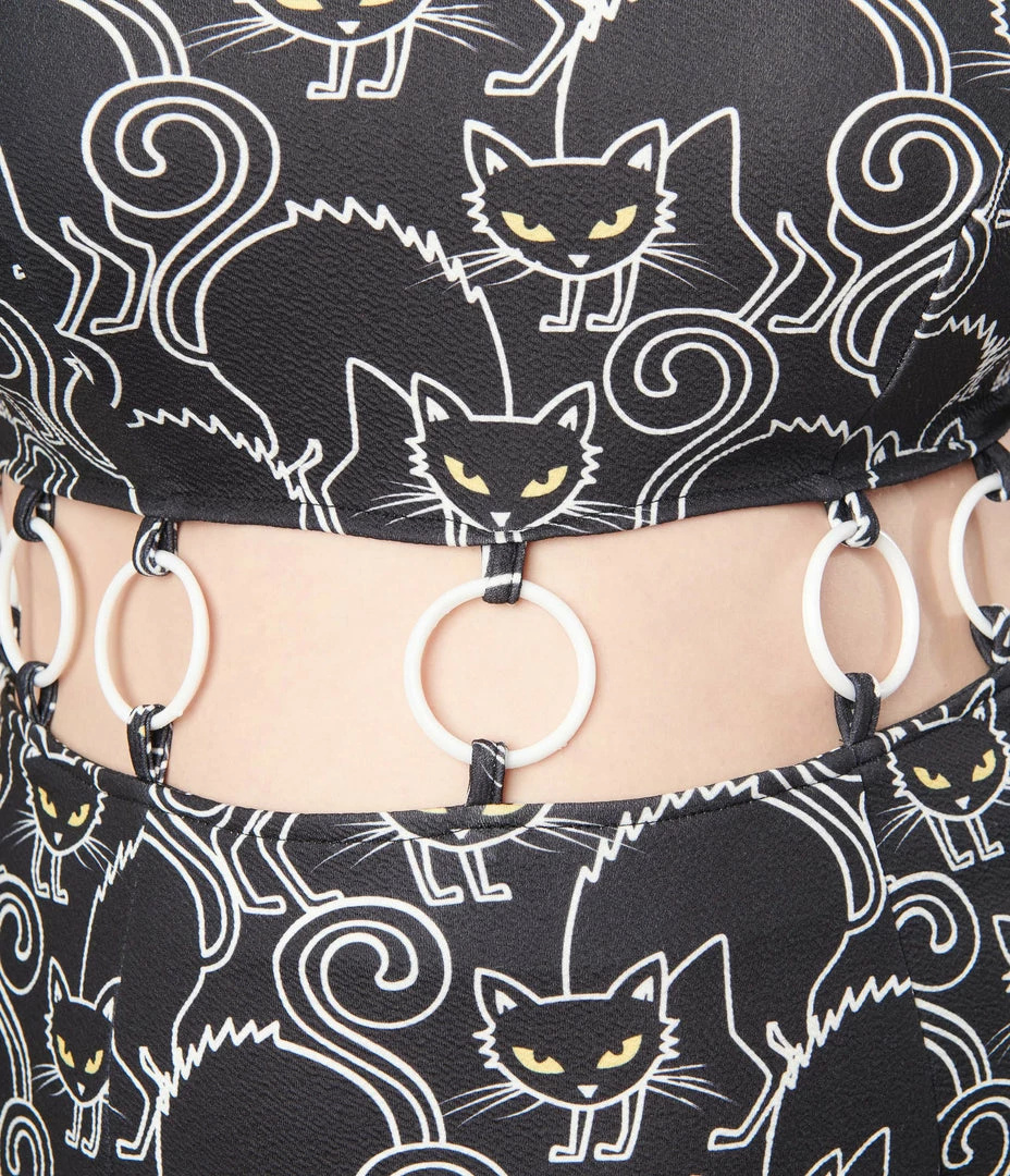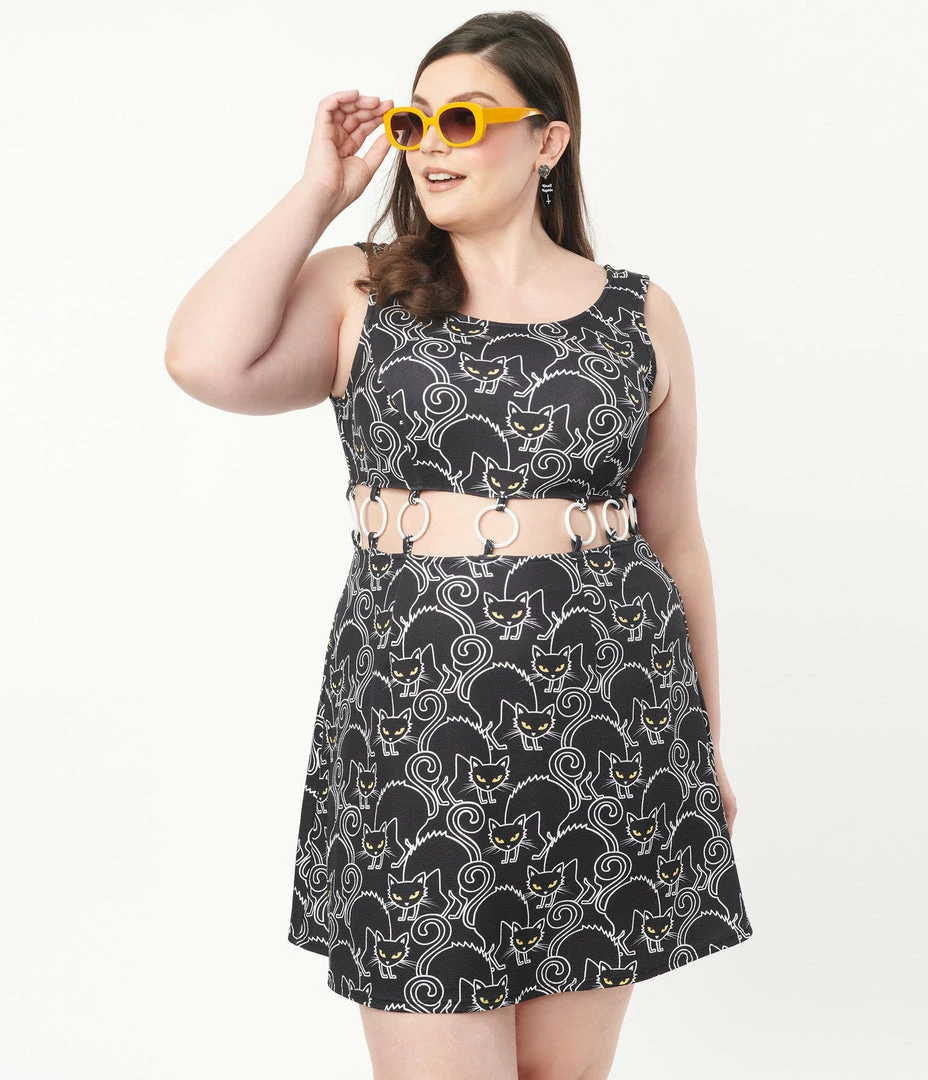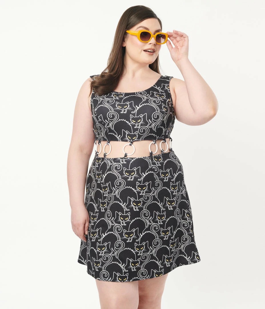 This flirtatious plus size dress is crafted in a marvelous stretch blend that dazzles with an all over print of black scaredy cats with yellow eyes. The bodice is topped by a scoop neckline while the dynamite cutout waist is embellished with ivory hoops for an eye-catching accent!