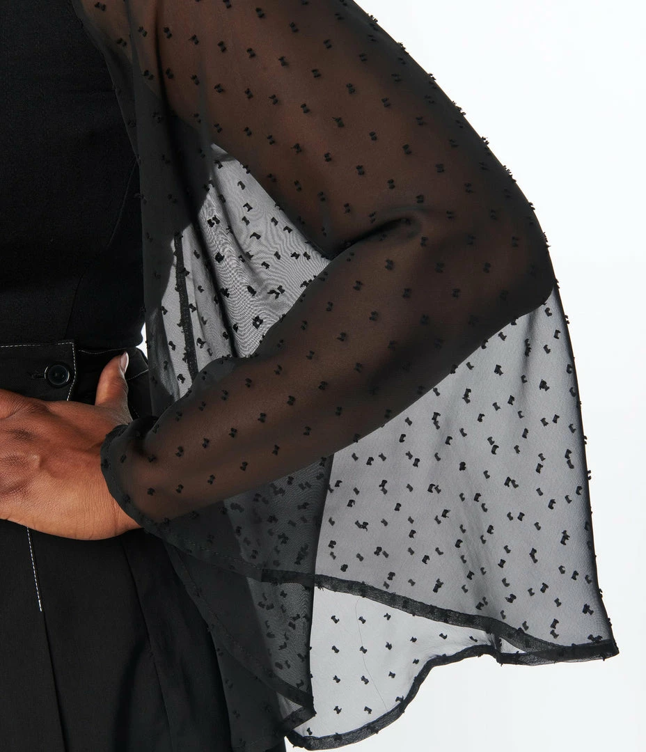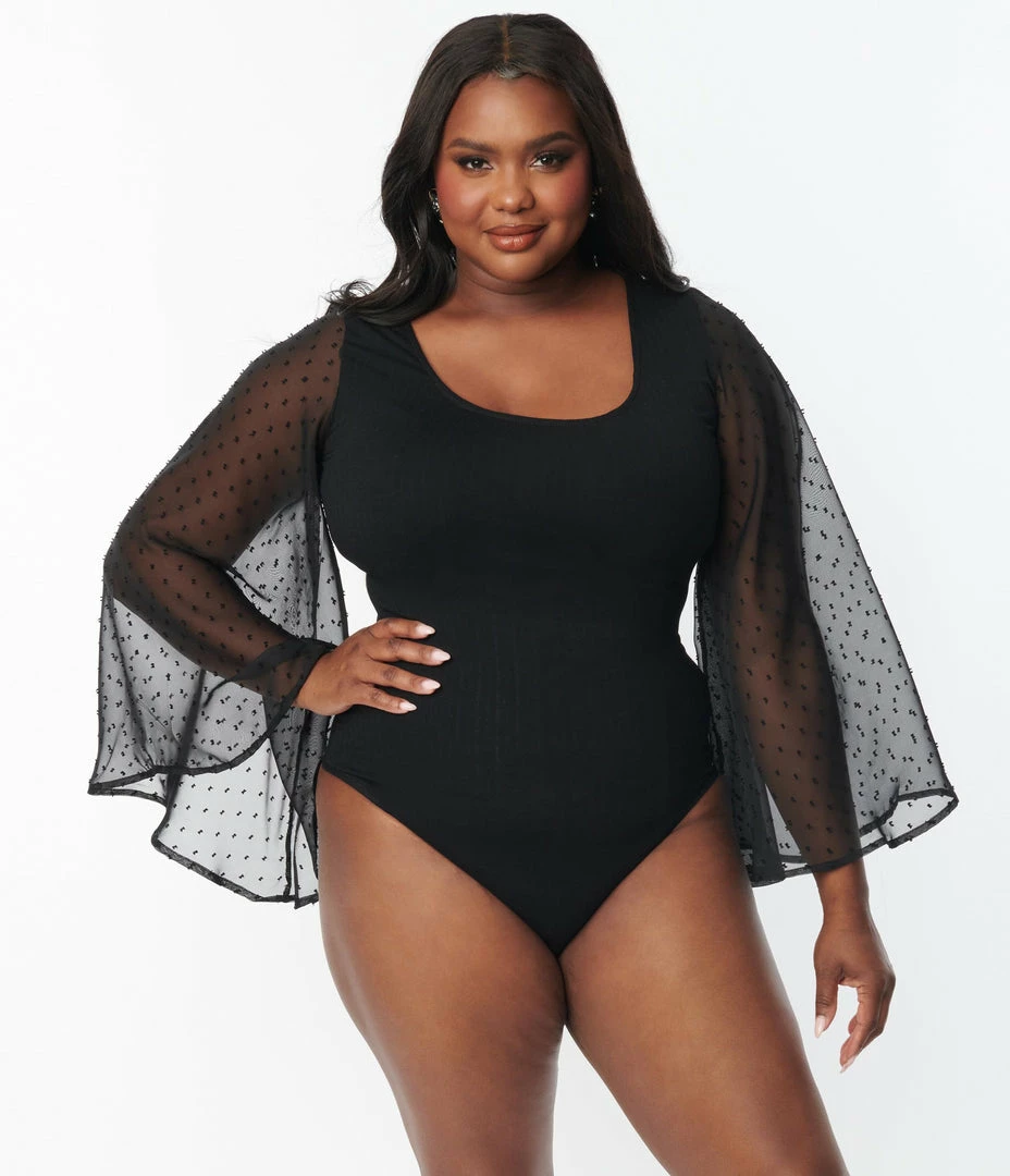 This striking plus size bodysuit is crafted in a soft black knit and features sheer long bell sleeves, dancing with Swiss dots throughout. Complete with a scoop neckline and a dual snap button closure.