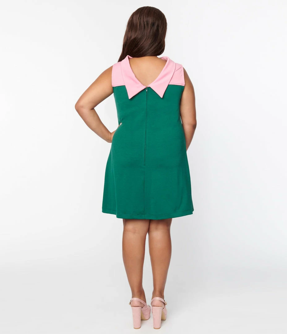 This sultry plus size mini dress is crafted in a color blocked knit of an emerald green silhouette and pink yoke, complete with daisy patch pockets. Outfitted with a back zipper.