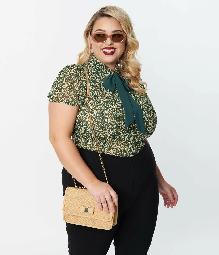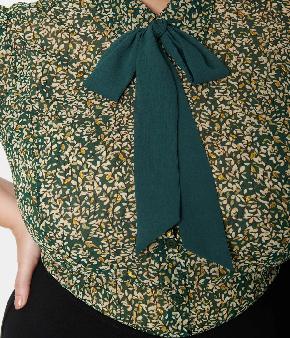This chic plus size blouse is crafted in a semi-sheer chiffon woven fabric featuring white and gold leaf print throughout the green background. Outfitted with a button up front and a green removable neck tie in for versatile styling.