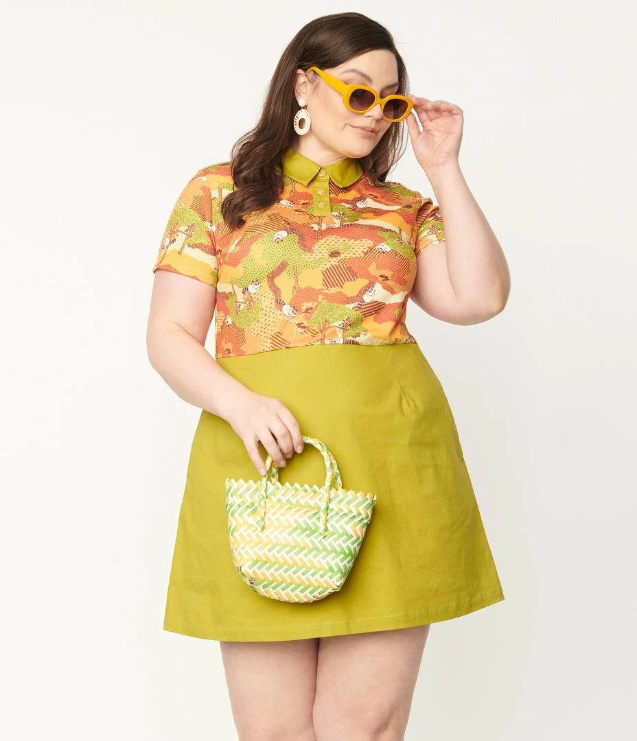 This charming plus size mini dress is crafted in a knit fabric and features a sweet print of raccoons in a park during the fall, in shades of orange, green and brown. The partial button front leads to a solid green collar framed by short sleeves. The solid green woven skirt drops from the seamed waist features side pockets and is secured by the side zipper.