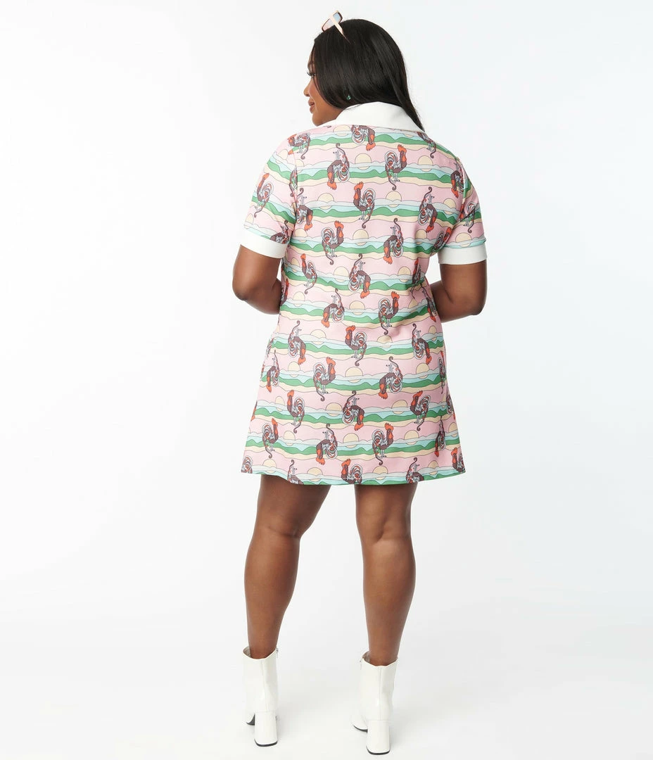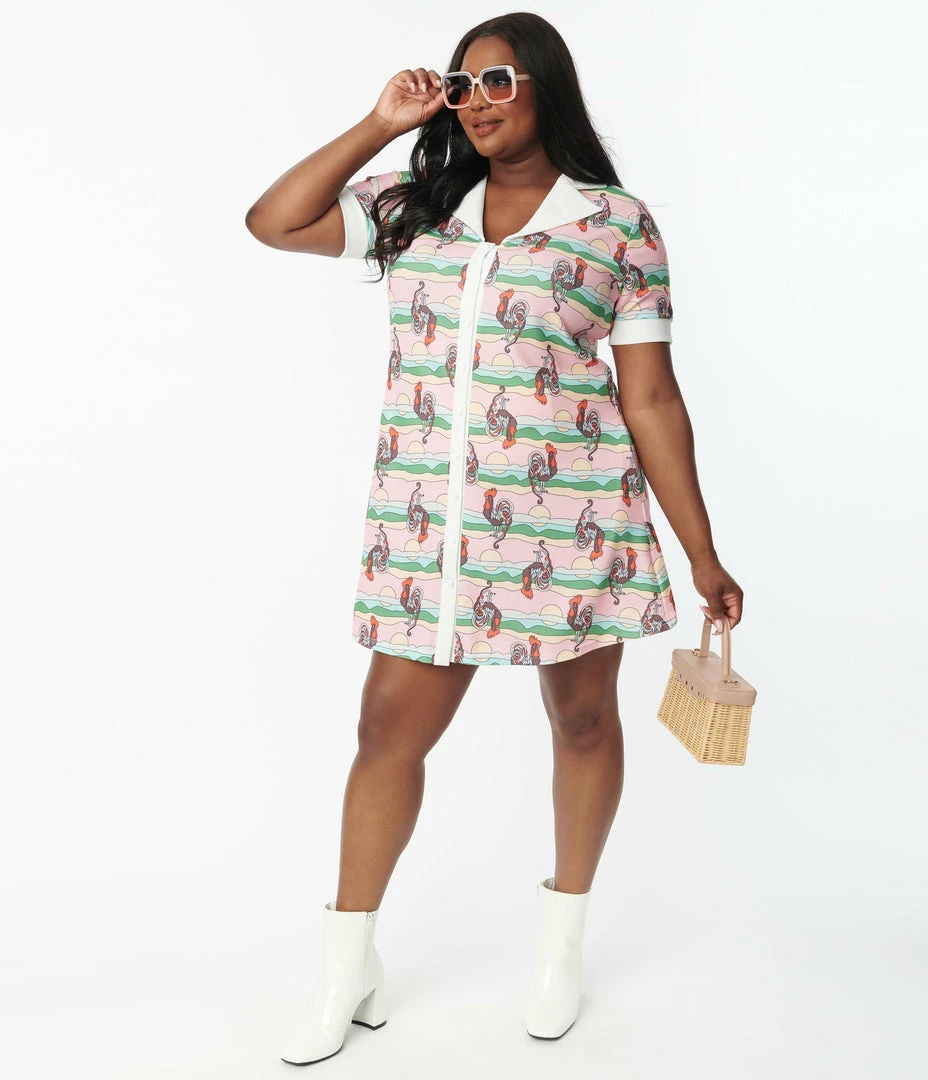 This adorable plus size dress is crafted in a fabulous stretch knit fabric that boasts a sweet print of groovy roosters basking in the pink sunrise. The front button placket leads to a classic solid white notched lapel collar framed by short sleeves. Complete with side pockets.