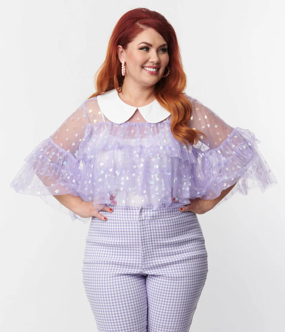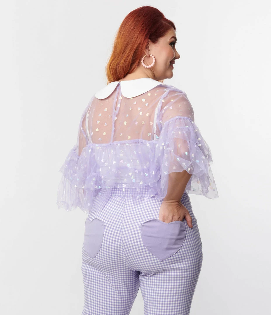This sweet plus size crop top is crafted in a fabulous lavender sheer mesh that dances with iridescent hearts. The relaxed ruffled silhouette boasts a contrasting white Peter Pan collar and three-quarter length sleeves.