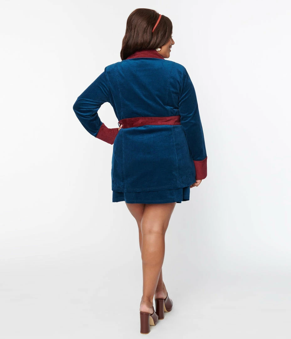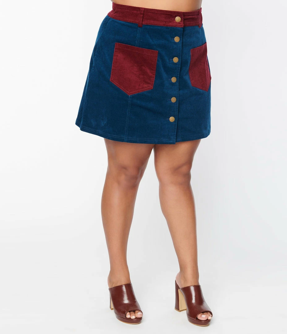 This retro plus size mini skirt is crafted in a sturdy corduroy and is cast in a navy blue and burgundy red color blocking. Complete with a button up front and front patch pockets.