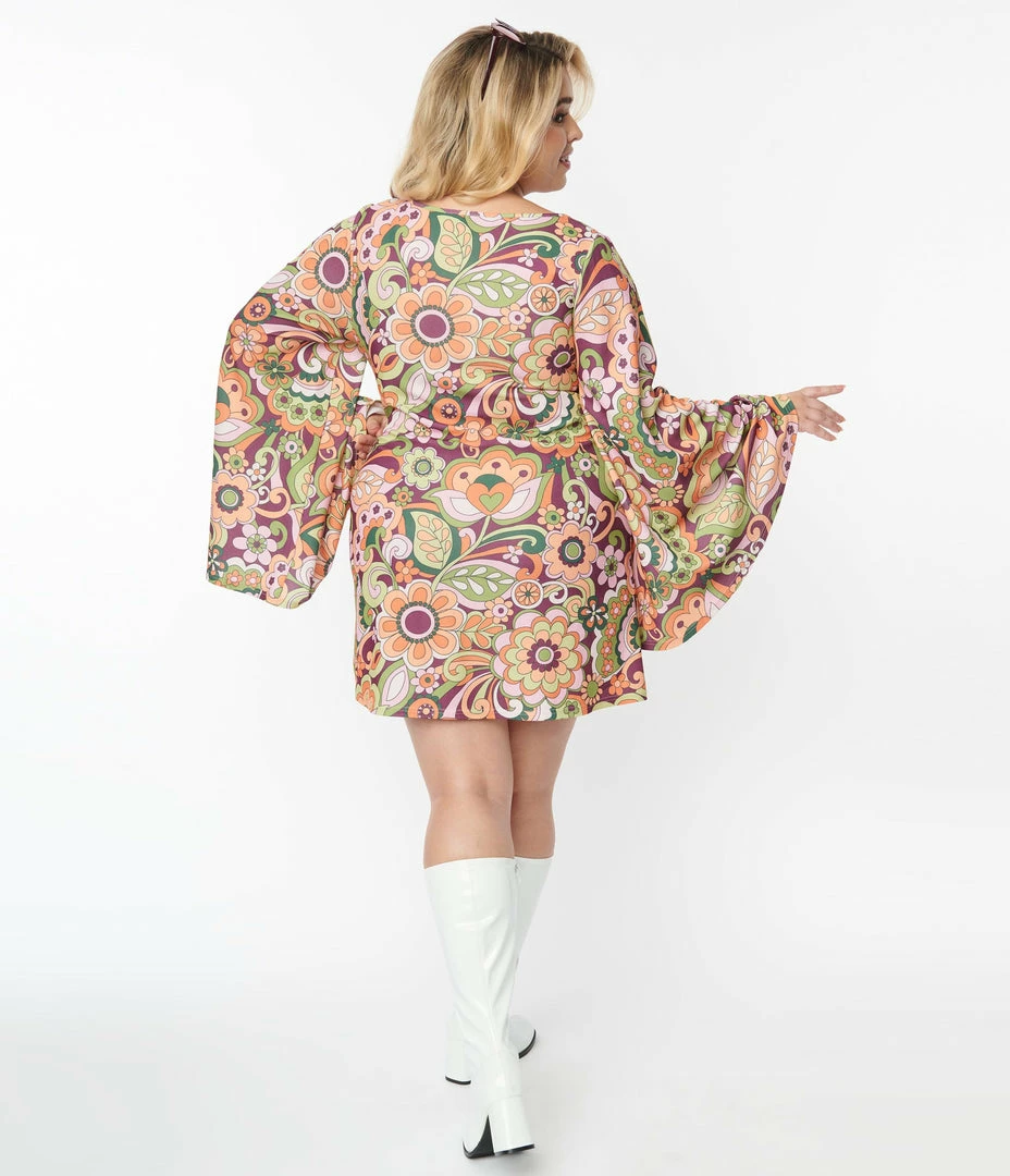 This flirtatious plus size piece is crafted in a marvelous stretch blend that dances with a groovy paisley pattern in shades of green, orange, pink, and purple. The wide scoop neckline is framed by jaw-dropping long angel sleeves, while the sultry short skirt is outfitted with side pockets for modern function!