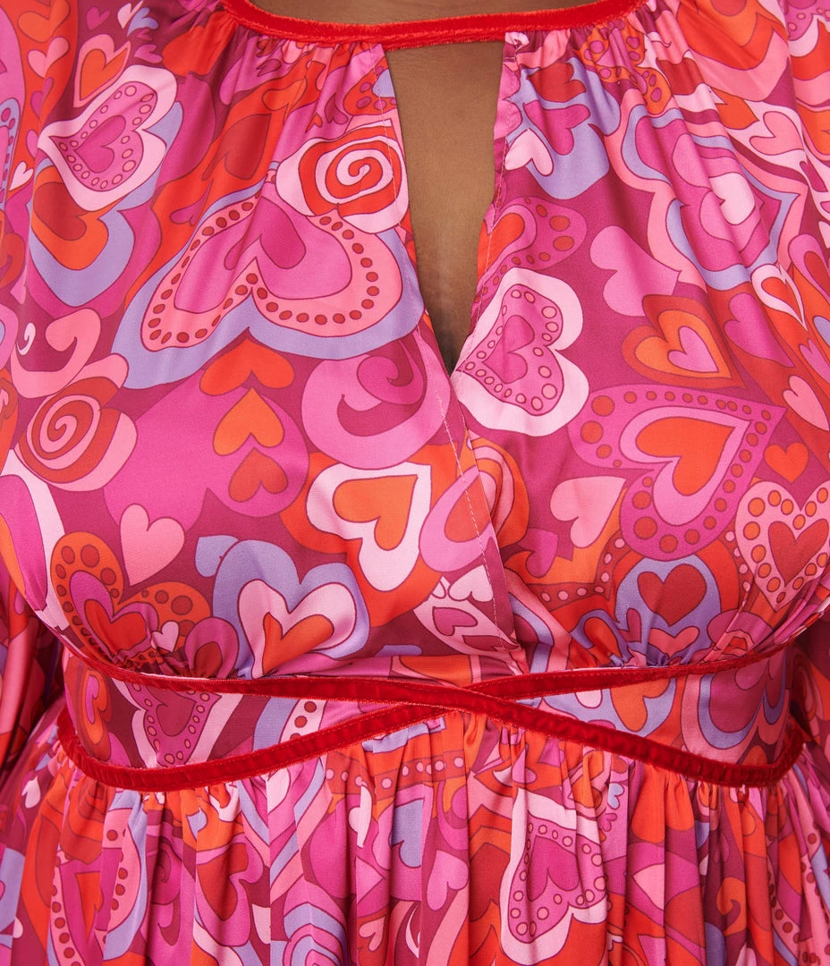 This dazzling plus size dress is cast in a smooth woven fabric that dances with a psychedelic print of hearts in red, pink, and fuchsia. The surplice bodice is trimmed at the collar in red velvet creating a sultry keyhole that is framed by dramatic bell sleeves. Complete with back zipper.