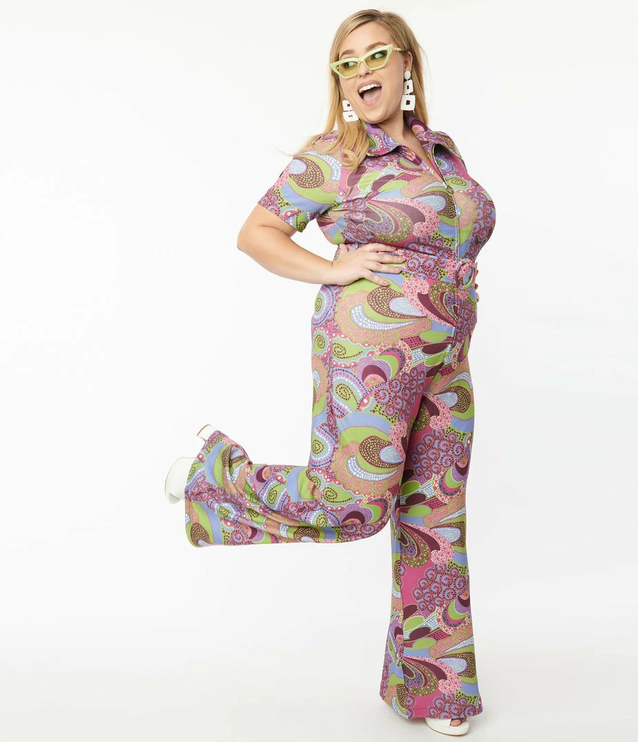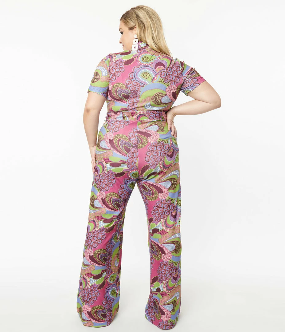 This groovy plus size jumpsuit is crafted in a textured knit and features an abstract paisley pattern in multiple purples, greens, and beige. Complete with a front zipper and belt.
