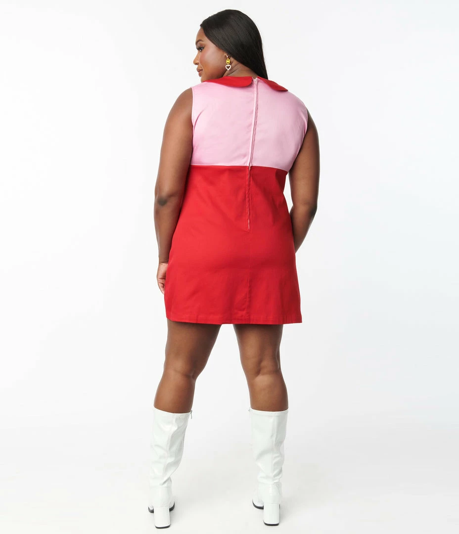 A sweet retro inspired plus size shift dress cast in a pink bodice and red A-line skirt. Boasting patch pockets on the skirt, complete with pink and red candy canes. Perfectly structured with bust darts, a scoop neck, and a back zipper.