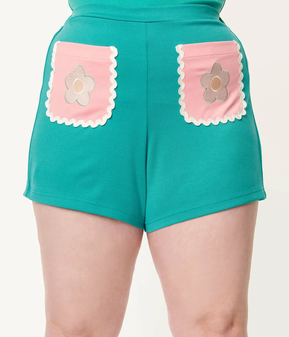 These plus size darling shorts are crafted in a teal knit stretch for vibrant vibes. The banded waist is cinched with a back elastic band while twin pink pockets boast a beautiful daisy patch for a dash of delight!