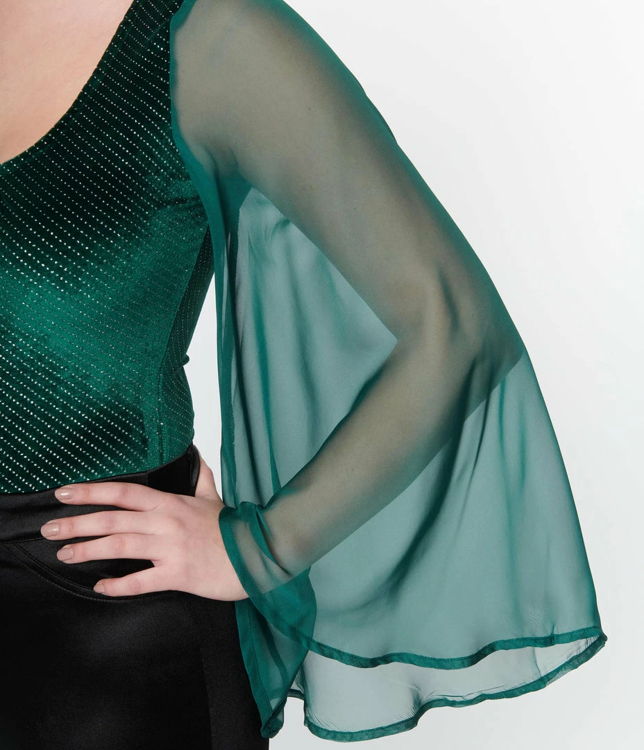 This striking bodysuit is crafted in a soft emerald velvet and features sheer long bell sleeves, dancing with silver pin dot glitter throughout. Complete with a scoop neckline and a dual snap button closure.