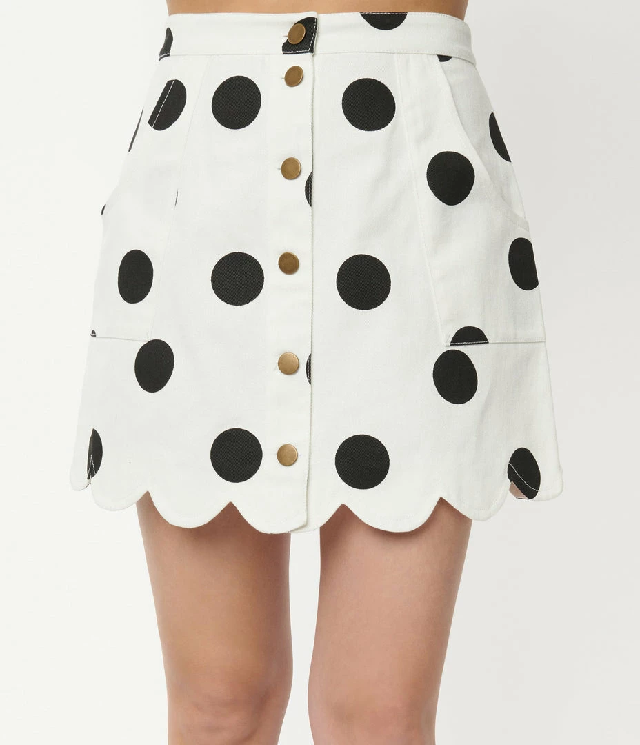 This flirtatious mini skirt from Smak Parlour is crafted in a fabulous white denim dancing with black polka dots. The button up front secures the fitted form while the scalloped hemline provides adorable embellishment. Outfitted with side pockets to stow away the pamphlets!