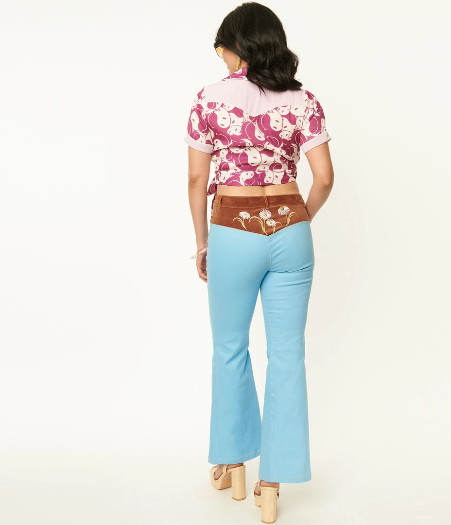 These cheerful jeans, in collaboration with Smiley®, are crafted in a sturdy light blue denim, topped with brown corduroy and featuring a cheerful embroidered pattern of Smiley® daisies on the back. The banded waist is secured with a classic front fly and button while side pockets provide function to these bell-bottom classics!