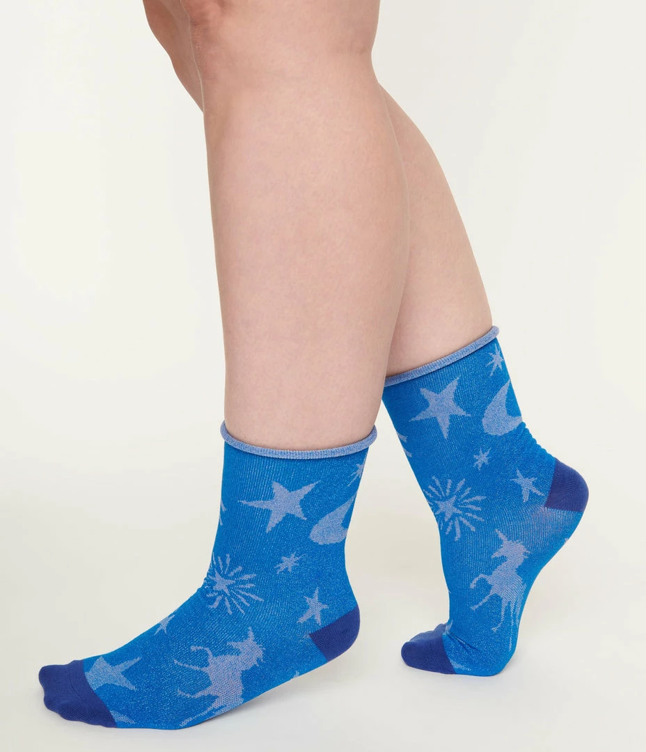 Add a magical touch to your look with these celestial print crew socks featuring unicorns, shooting stars, and moons, crafted in a soft blue cotton blend with metallic threads throughout. The roll-top cuff is perfect for scrunching for an effortlessly chic vibe.
