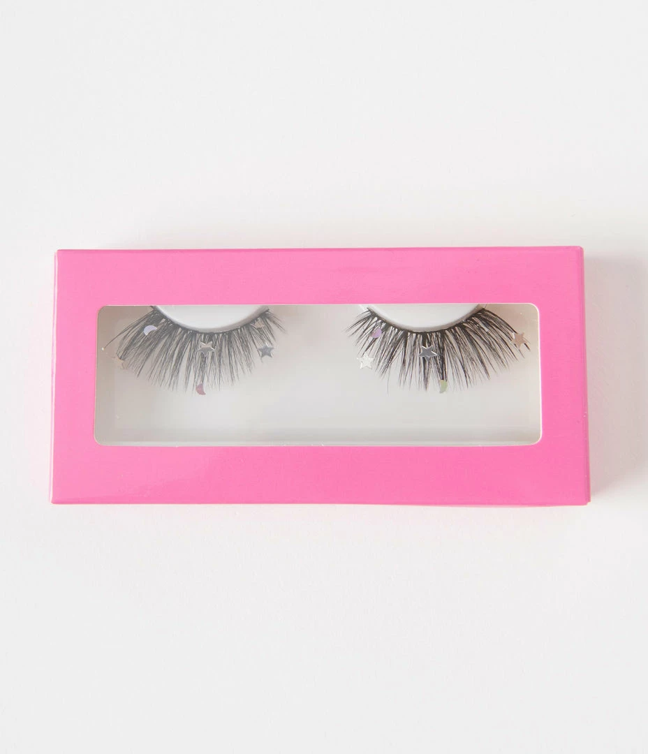 Get lost in the cosmos with these false lashes! Crafted in faux minx and secured on a black cotton band. Three silver stars and three silver moons are delicately positioned on the ends for added celestial flair!