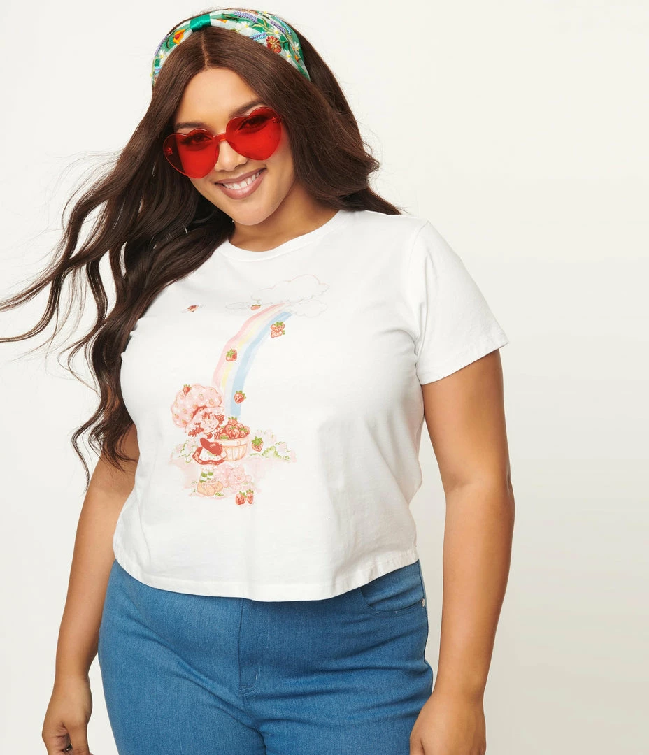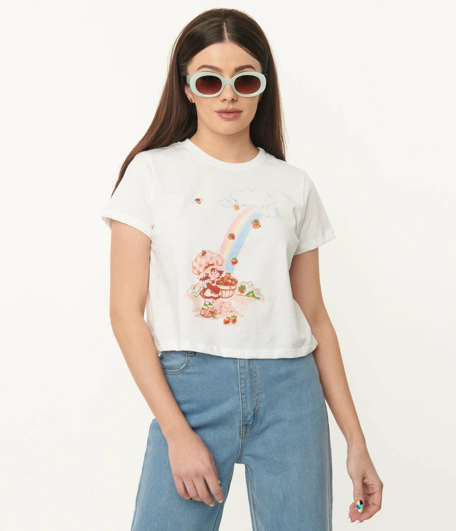 This sweet fitted tee is crafted in a soft white cotton knit and features a print of Strawberry Shortcake gathering strawberries as they drop from a rainbow. Complete with a crew neckline, short sleeves, and crop length hemline.