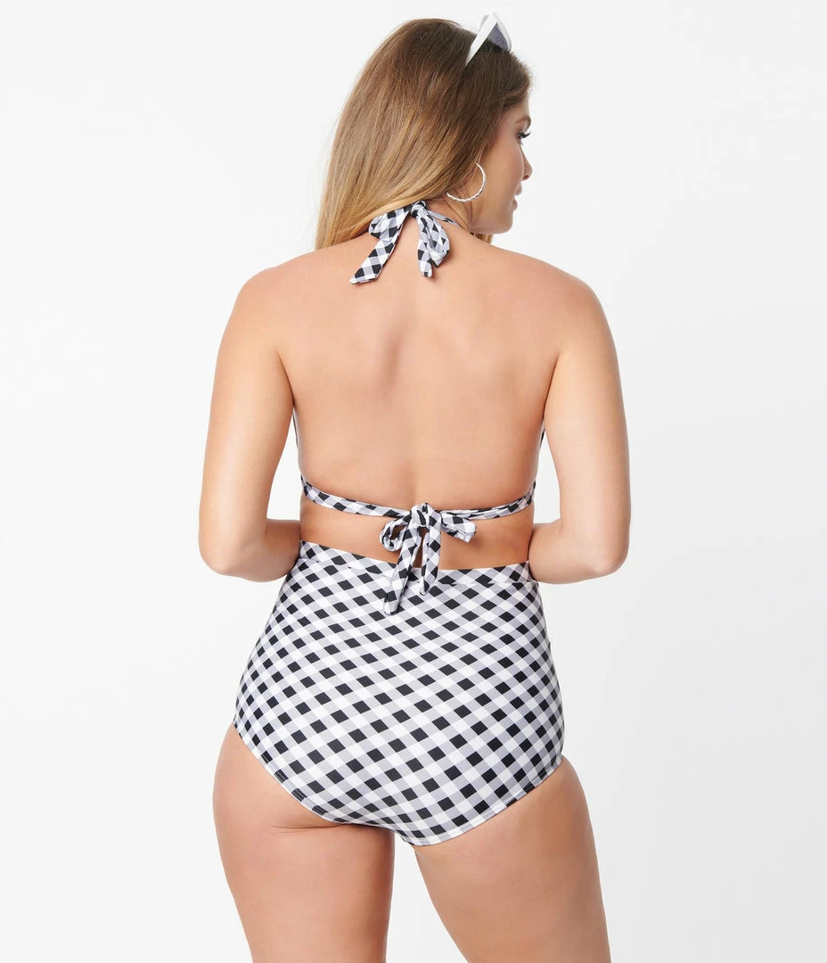 Deals 🥰 Swimwear Unique Vintage Black & White Gingham Monroe Halter Swim Top ⌛