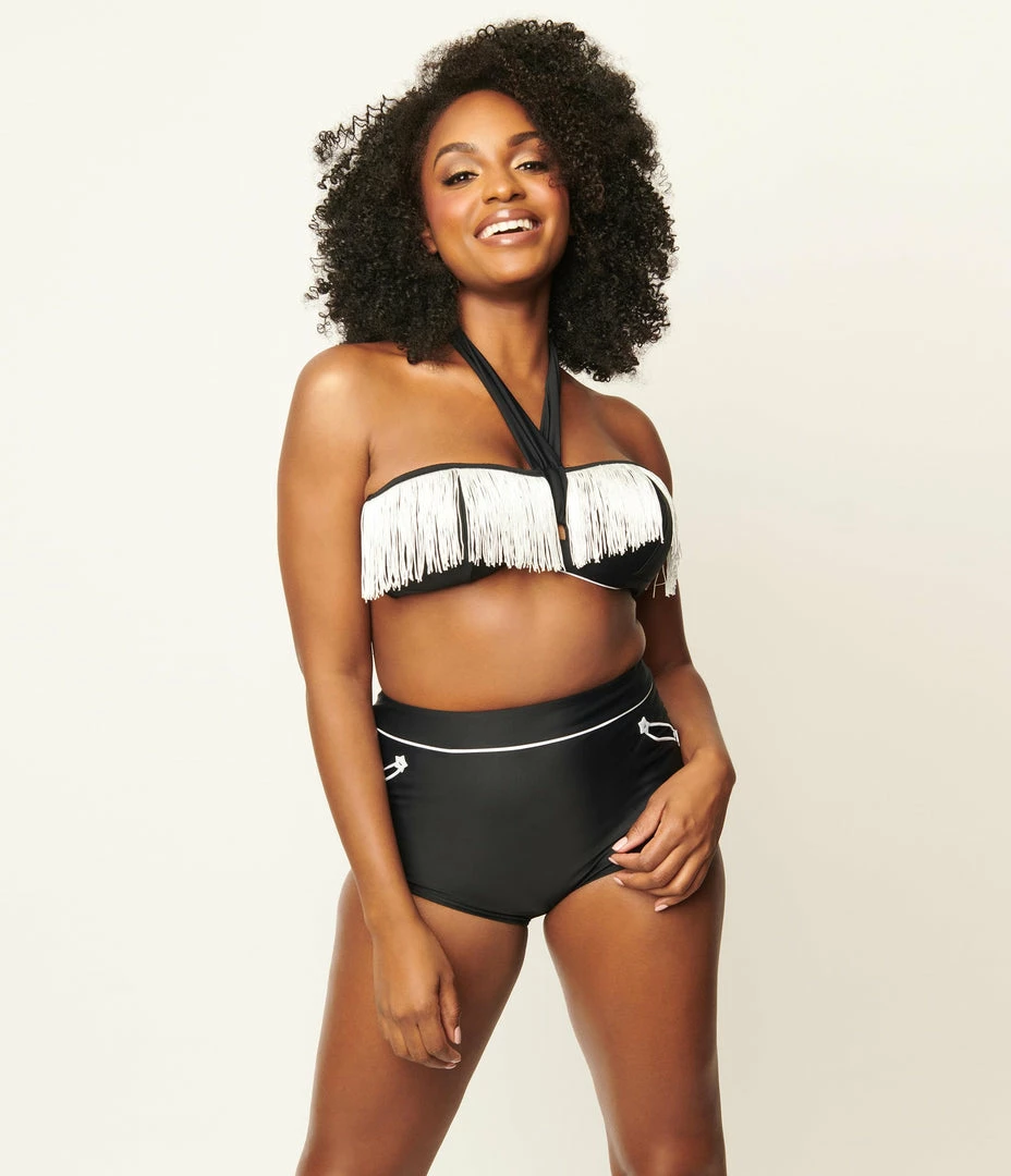 Beach daze always, gals! Keep the sun on your shoulders with this sweet swim top from Unique Vintage, featuring a beautiful accent of white western fringe that dances over the black silhouette. The peek-a-boo accent centers the top while sewn-in padding and boning provides subtle structure. The self tie halter and back provides a flattering fit and fully mesh lined for hours of fun!