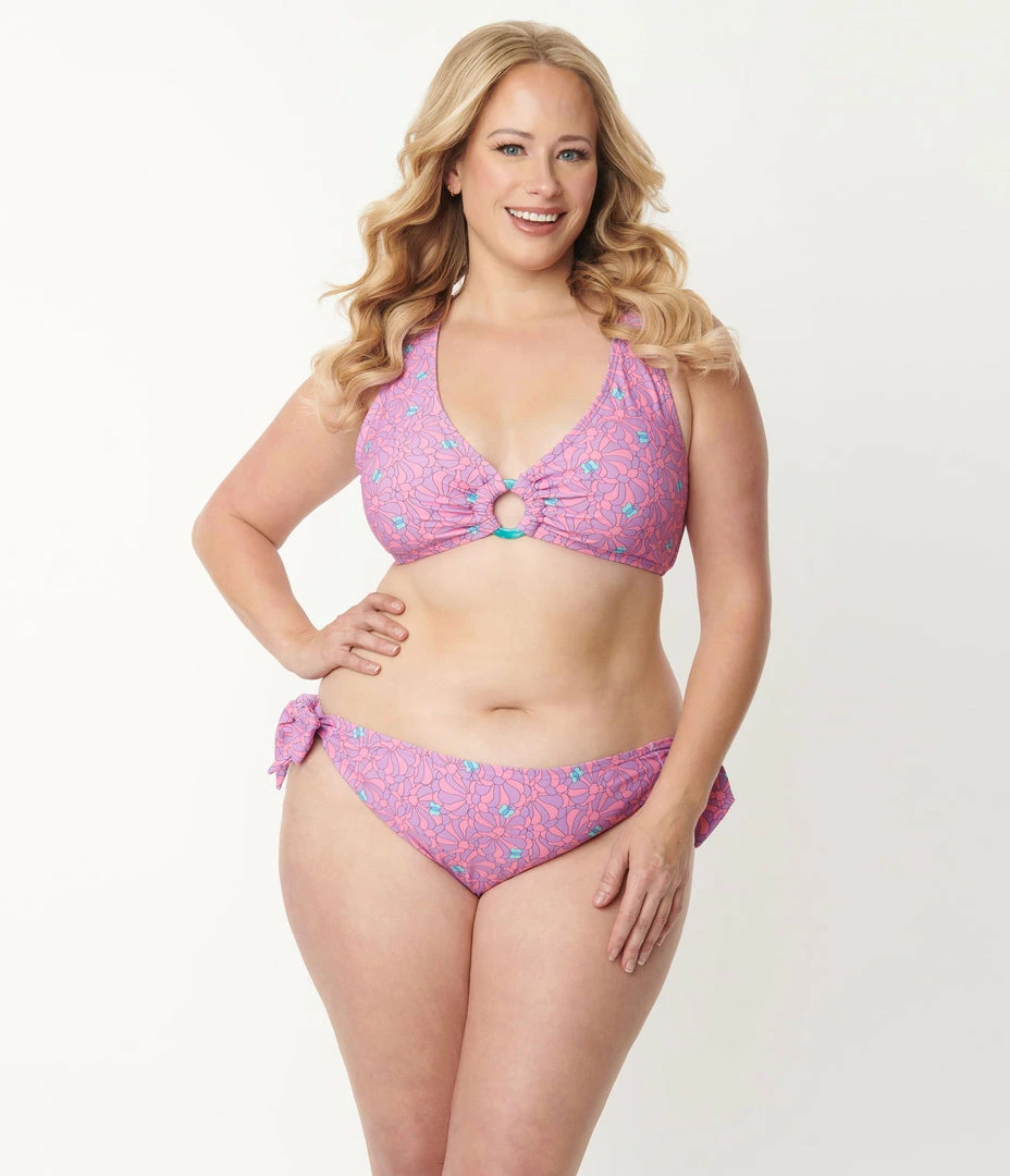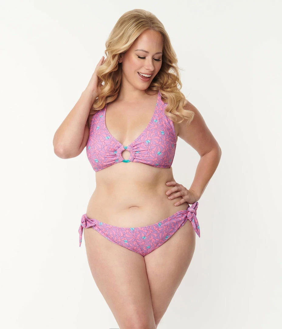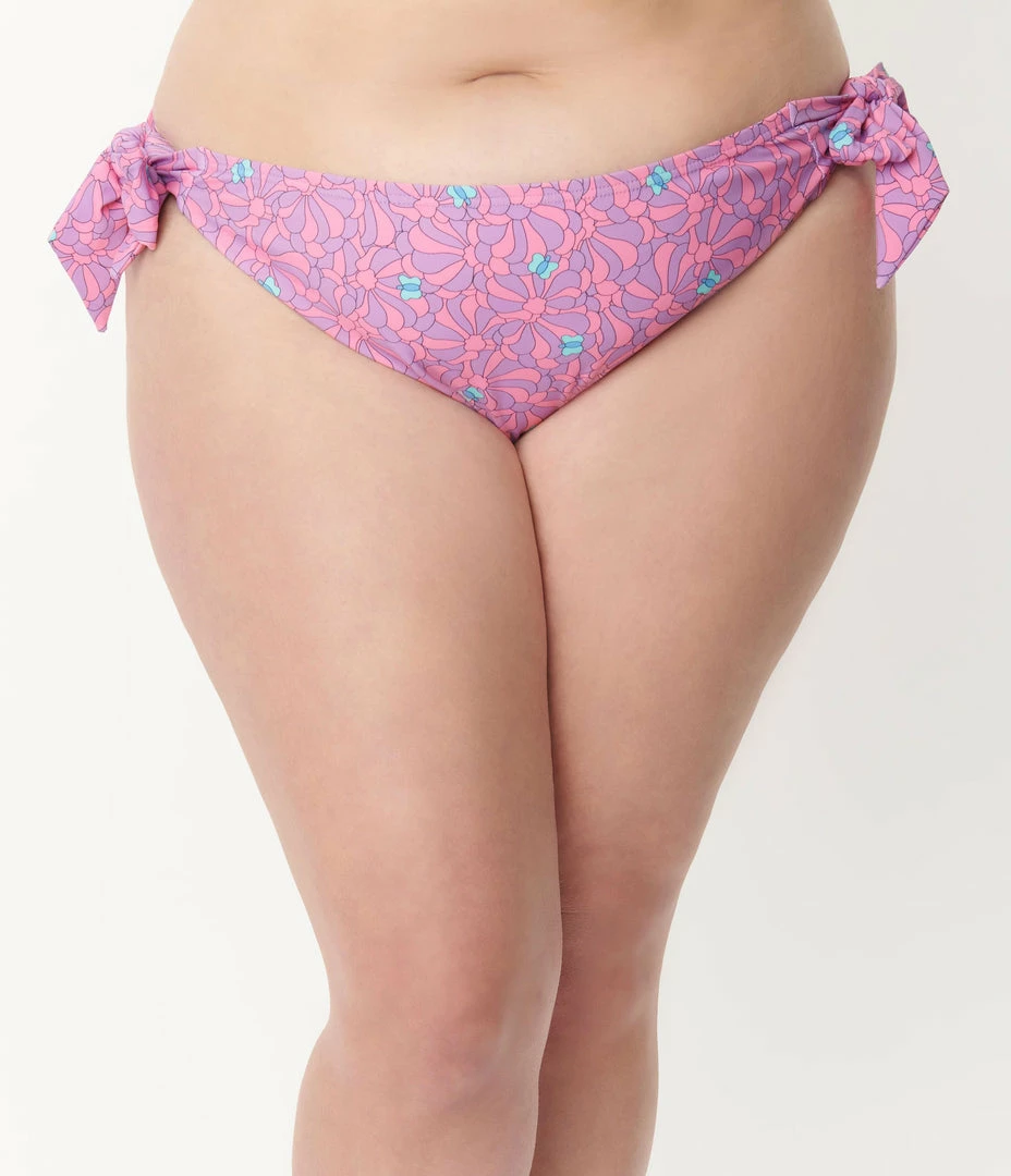Perfect for the poolside, darling! A sexy plus size swim bottom from Unique Vintage, this sensational pin-up piece features a groovy print of pink and purple florals, accented with blue butterflies throughout. The low cut legs feature adjustable self tie sides and are fully mesh lined for all day comfort!