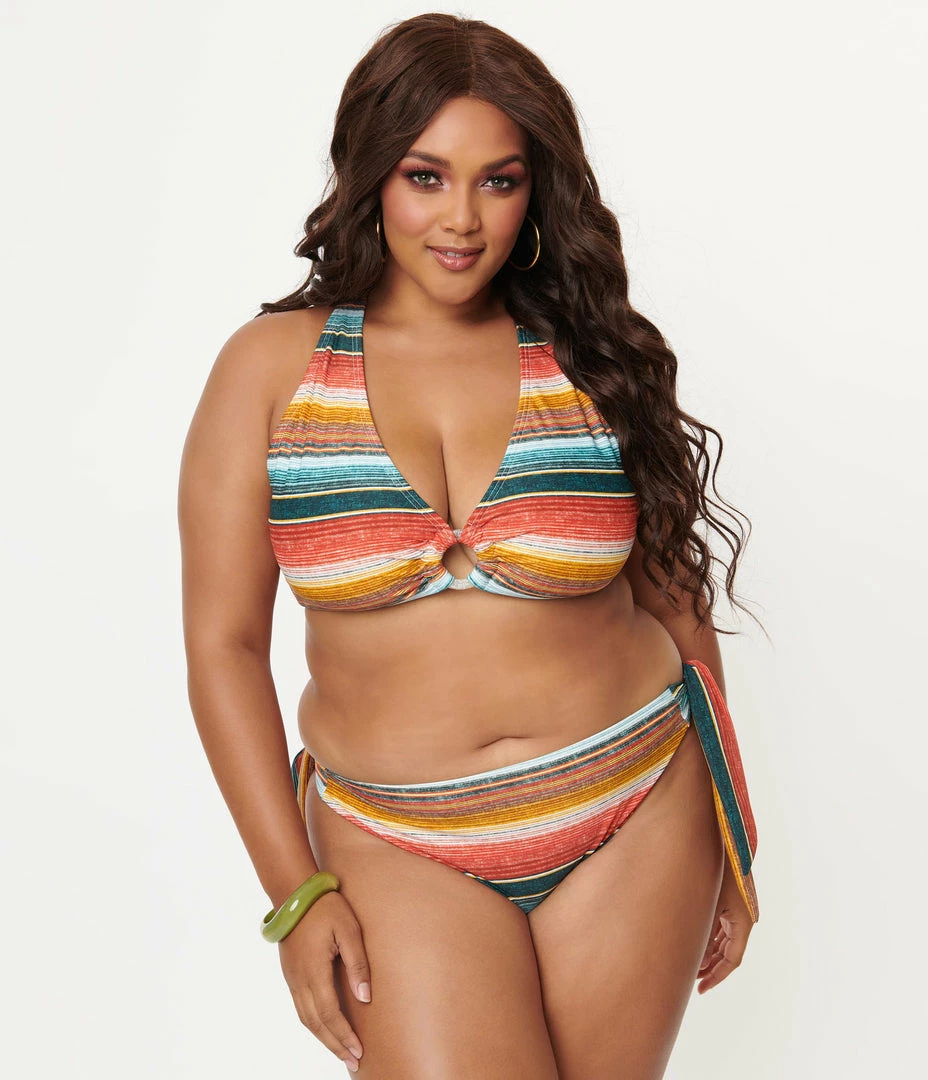 Float on, darling! A sexy plus size swim top from Unique Vintage, this sensational pin-up piece is set in a marvelous western print of multicolor serape stripes and boasting retro vibes. A sultry center ring draws all eyes your way while the adjustable straps, removable padding, and hook back provide a comfortable fit.