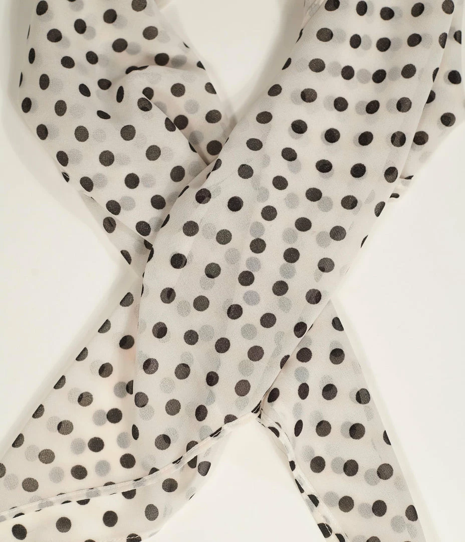 Exhibit your retro pin-up silhouette with this classic pattern. Crafted in an off white chiffon that boasts black polka dots. This hair scarf is perfect for tying up and around your divine ‘do – any excuse for a little sky-high hair help!
